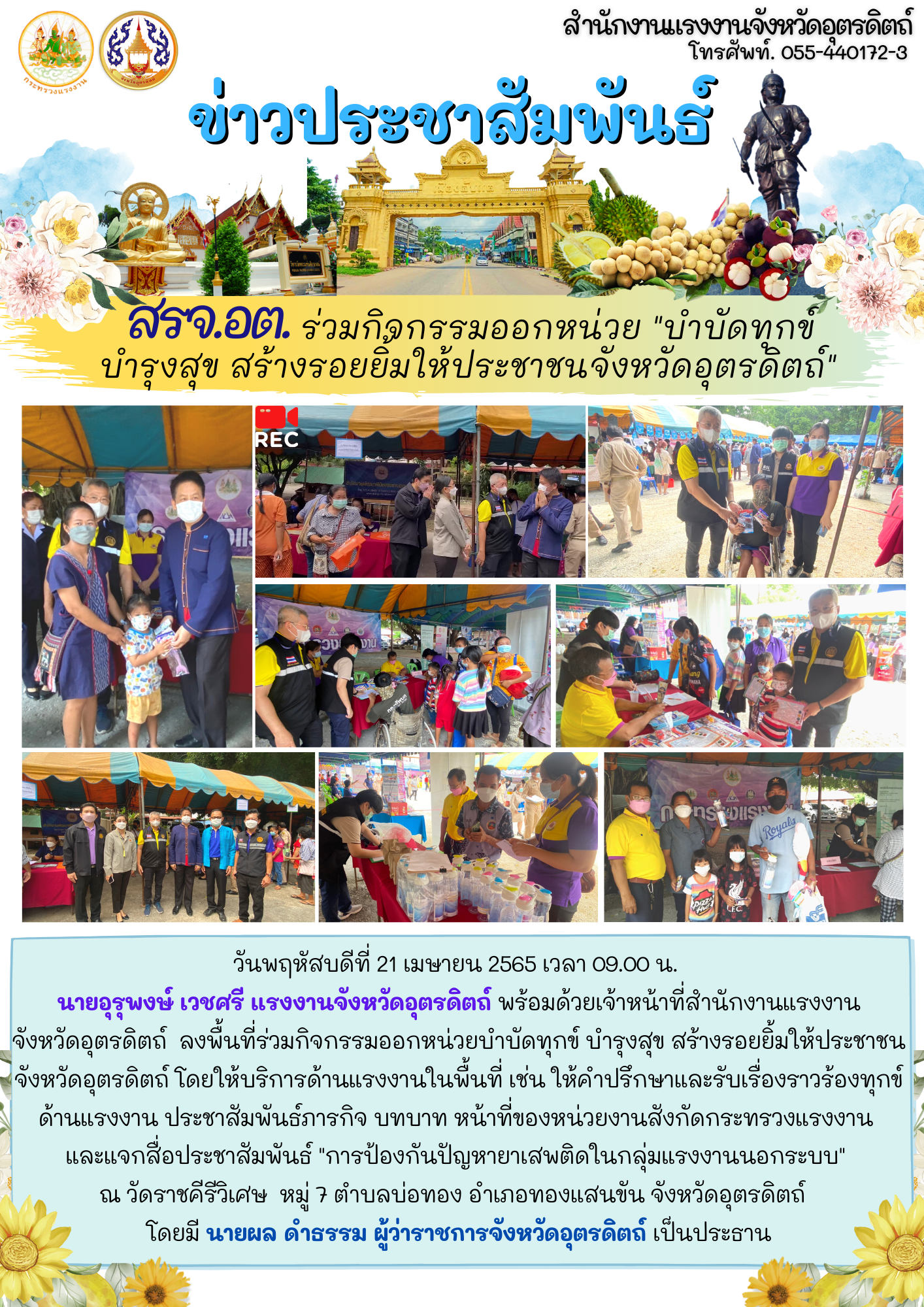 วันพฤหัสบดีที่ 21 เมษายน 2565 เวลา 09.00 น. นายอุรุพงษ์ เวชศรี แรงงานจังหวัดอุตรดิตถ์ พร้อมด้วยเจ้าหน้าที่สำนักงานแรงงานจังหวัดอุตรดิตถ์ ลงพื้นที่ร่วมกิจกรรมออกหน่วยบำบัดทุกข์ บำรุงสุข สร้างรอยยิ้มให้ประชาชนจังหวัดอุตรดิตถ์ โดยให้บริการด้านแรงงานในพื้นที่ เช่น ให้คำปรึกษาและรับเรื่องราวร้องทุกข์ด้านแรงงาน ประชาสัมพันธ์ภารกิจ บทบาท หน้าที่ของหน่วยงานสังกัดกระทรวงแรงงาน และแจกสื่อประชาสัมพันธ์ “การป้องกันปัญหายาเสพติดในกลุ่มแรงงานนอกระบบ” ณ วัดราชคีรีวิเศษ หมู่ 7 ตำบลบ่อทอง อำเภอทองแสนขัน จังหวัดอุตรดิตถ์ โดยมี นายผล ดำธรรม ผู้ว่าราชการจังหวัดอุตรดิตถ์ เป็นประธาน