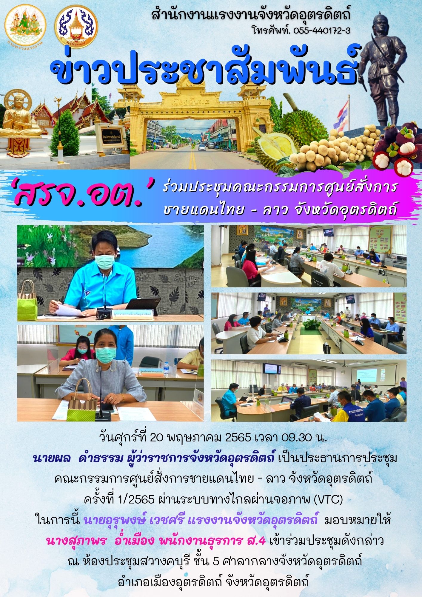 วันศุกร์ที่ 20 พฤษภาคม 2565 เวลา 09.30 น. นายผล ดำธรรม ผู้ว่าราชการจังหวัดอุตรดิตถ์ เป็นประธานการประชุมคณะกรรมการศูนย์สั่งการชายแดนไทย – ลาว จังหวัดอุตรดิตถ์ ครั้งที่ 1/2565 ผ่านระบบทางไกลผ่านจอภาพ (VTC) ในการนี้ นายอุรุพงษ์ เวชศรี แรงงานจังหวัดอุตรดิตถ์ มอบหมายให้ นางสุภาพร อ่ำเมือง พนักงานธุรการ ส.4 เข้าร่วมประชุมดังกล่าว ณ ห้องประชุมสวางคบุรี ชั้น 5 ศาลากลางจังหวัดอุตรดิตถ์ อำเภอเมืองอุตรดิตถ์ จังหวัดอุตรดิตถ์