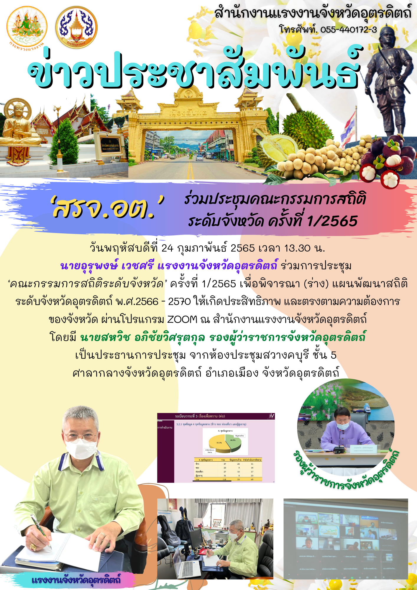 วันพฤหัสบดีที่ 24 กุมภาพันธ์ 2565 เวลา 13.30 น. นายอุรุพงษ์ เวชศรี แรงงานจังหวัดอุตรดิตถ์ ร่วมการประชุม ‘คณะกรรมการสถิติระดับจังหวัด’ ครั้งที่ 1/2565 เพื่อพิจารณา (ร่าง) แผนพัฒนาสถิติระดับจังหวัดอุตรดิตถ์ พ.ศ.2566 – 2570 ให้เกิดประสิทธิภาพ และตรงตามความต้องการของจังหวัด ผ่านโปรแกรม ZOOM ณ สำนักงานแรงงานจังหวัดอุตรดิตถ์ โดยมี นายสหวิช อภิชัยวิศรุตกุล รองผู้ว่าราชการจังหวัดอุตรดิตถ์ เป็นประธานการประชุม จากห้องประชุมสวางคบุรี ชั้น 5 ศาลากลางจังหวัดอุตรดิตถ์ อำเภอเมือง จังหวัดอุตรดิตถ์