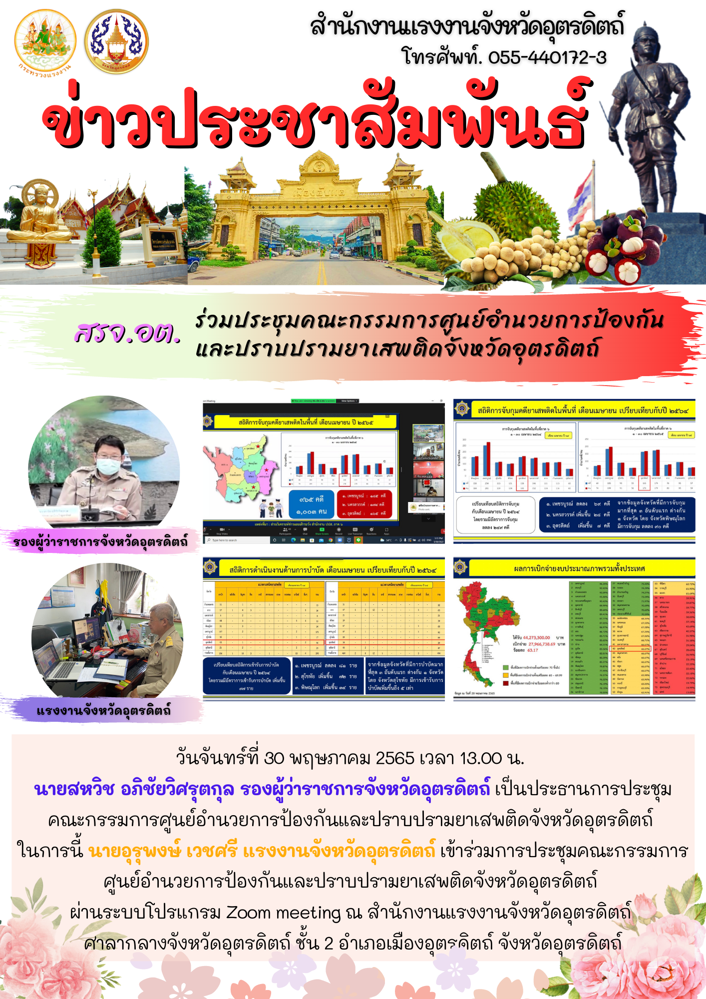 วันจันทร์ที่ 30 พฤษภาคม 2565 เวลา 13.00 น. นายสหวิช อภิชัยวิศรุตกุล รองผู้ว่าราชการจังหวัดอุตรดิตถ์ เป็นประธานการประชุมคณะกรรมการศูนย์อำนวยการป้องกันและปราบปรามยาเสพติดจังหวัดอุตรดิตถ์ ในการนี้ นายอุรุพงษ์ เวชศรี แรงงานจังหวัดอุตรดิตถ์ เข้าร่วมการประชุมคณะกรรมการศูนย์อำนวยการป้องกันและปราบปรามยาเสพติดจังหวัดอุตรดิตถ์ ผ่านระบบโปรแกรม Zoom meeting ณ สำนักงานแรงงานจังหวัดอุตรดิตถ์ ศาลากลางจังหวัดอุตรดิตถ์ ชั้น 2 อำเภอเมืองอุตรดิตถ์ จังหวัดอุตรดิตถ์