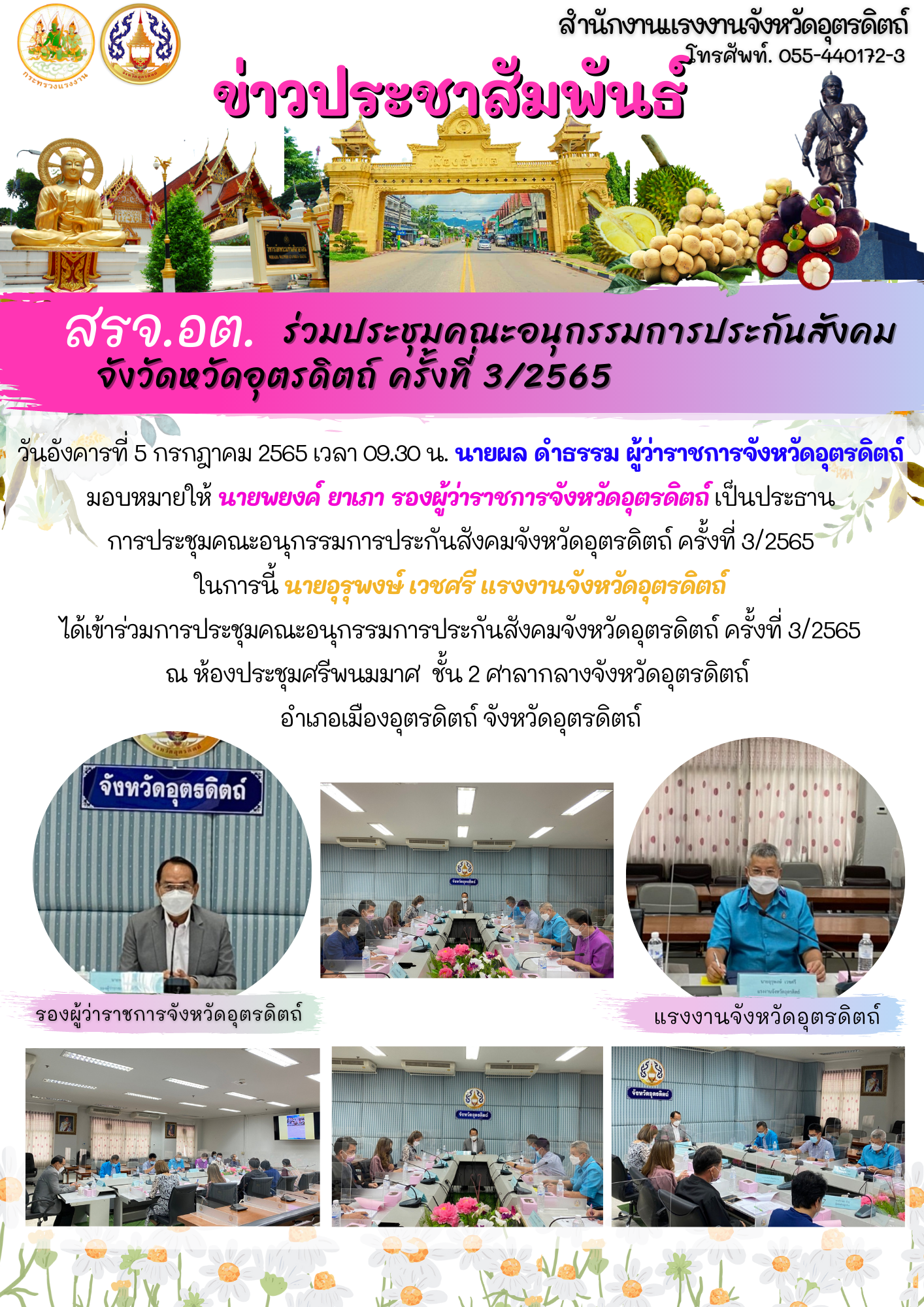 วันอังคารที่ 5 กรกฎาคม 2565 เวลา 09.30 น. นายผล ดำธรรม ผู้ว่าราชการจังหวัดอุตรดิตถ์มอบหมายให้ นายพยงค์ ยาเภา รองผู้ว่าราชการจังหวัดอุตรดิตถ์ เป็นประธานการประชุมคณะอนุกรรมการประกันสังคมจังหวัดอุตรดิตถ์ ครั้งที่ 3/2565 ในการนี้ นายอุรุพงษ์ เวชศรี แรงงานจังหวัดอุตรดิตถ์ ได้เข้าร่วมการประชุมคณะอนุกรรมการประกันสังคมจังหวัดอุตรดิตถ์ ครั้งที่ 3/2565 ณ ห้องประชุมศรีพนมมาศ ชั้น 2 ศาลากลางจังหวัดอุตรดิตถ์ อำเภอเมืองอุตรดิตถ์ จังหวัดอุตรดิตถ์