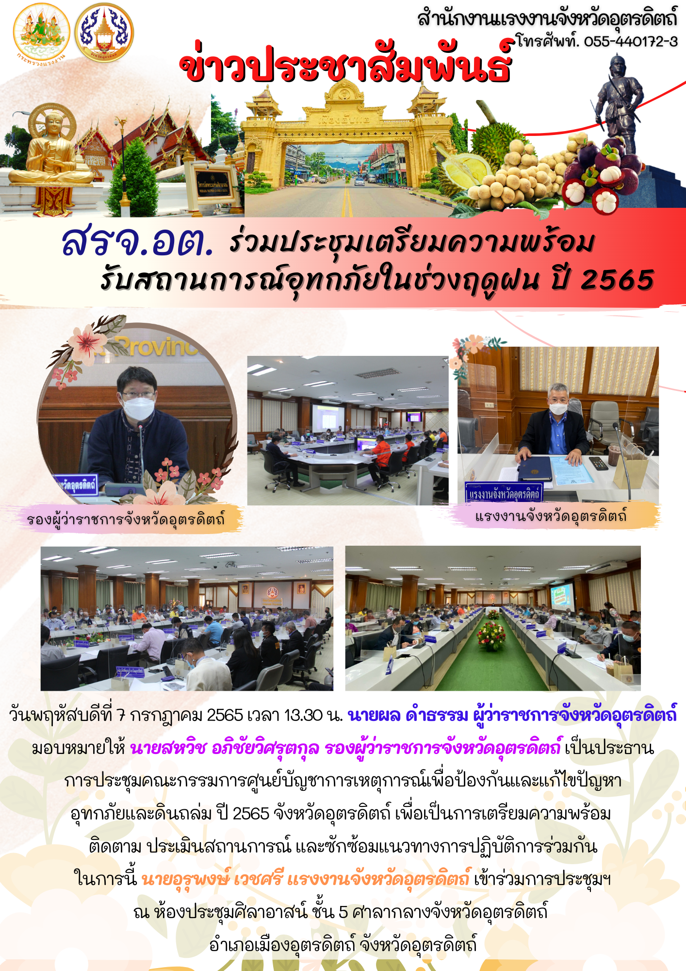 วันพฤหัสบดีที่ 7 กรกฎาคม 2565 เวลา 13.30 น. นายผล ดำธรรม ผู้ว่าราชการจังหวัดอุตรดิตถ์ มอบหมายให้ นายสหวิช อภิชัยวิศรุตกุล รองผู้ว่าราชการจังหวัดอุตรดิตถ์ เป็นประธานการประชุมคณะกรรมการศูนย์บัญชาการเหตุการณ์เพื่อป้องกันและแก้ไขปัญหาอุทกภัยและดินถล่ม ปี 2565 จังหวัดอุตรดิตถ์ เพื่อเป็นการเตรียมความพร้อม ติดตาม ประเมินสถานการณ์ และซักซ้อมแนวทางการปฏิบัติการร่วมกัน ในการนี้ นายอุรุพงษ์ เวชศรี แรงงานจังหวัดอุตรดิตถ์ เข้าร่วมการประชุมฯ ณ ห้องประชุมศิลาอาสน์ ชั้น 5 ศาลากลางจังหวัดอุตรดิตถ์ อำเภอเมืองอุตรดิตถ์ จังหวัดอุตรดิตถ์