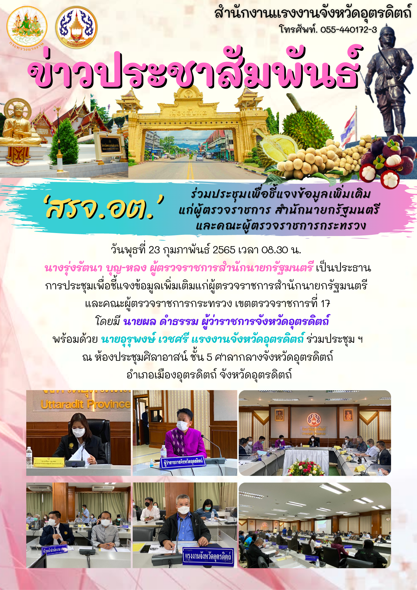 วันพุธที่ 23 กุมภาพันธ์ 2565 เวลา 08.30 น. นางรุ่งรัตนา บุญ-หลง ผู้ตรวจราชการสำนักนายกรัฐมนตรี เป็นประธานการประชุมเพื่อชี้แจงข้อมูลเพิ่มเติมแก่ผู้ตรวจราชการสำนักนายกรัฐมนตรี และคณะผู้ตรวจราชการกระทรวง เขตตรวจราชการที่ 17 โดยมี นายผล ดำธรรม ผู้ว่าราชการจังหวัดอุตรดิตถ์ พร้อมด้วย นายอุรุพงษ์ เวชศรี แรงงานจังหวัดอุตรดิตถ์ และข้าราชการเจ้าหน้าที่หน่วยงานอื่นที่เกี่ยวข้อง ร่วมประชุม ฯ ณ ห้องประชุมศิลาอาสน์ ชั้น 5 ศาลากลางจังหวัดอุตรดิตถ์ อำเภอเมืองอุตรดิตถ์ จังหวัดอุตรดิตถ์