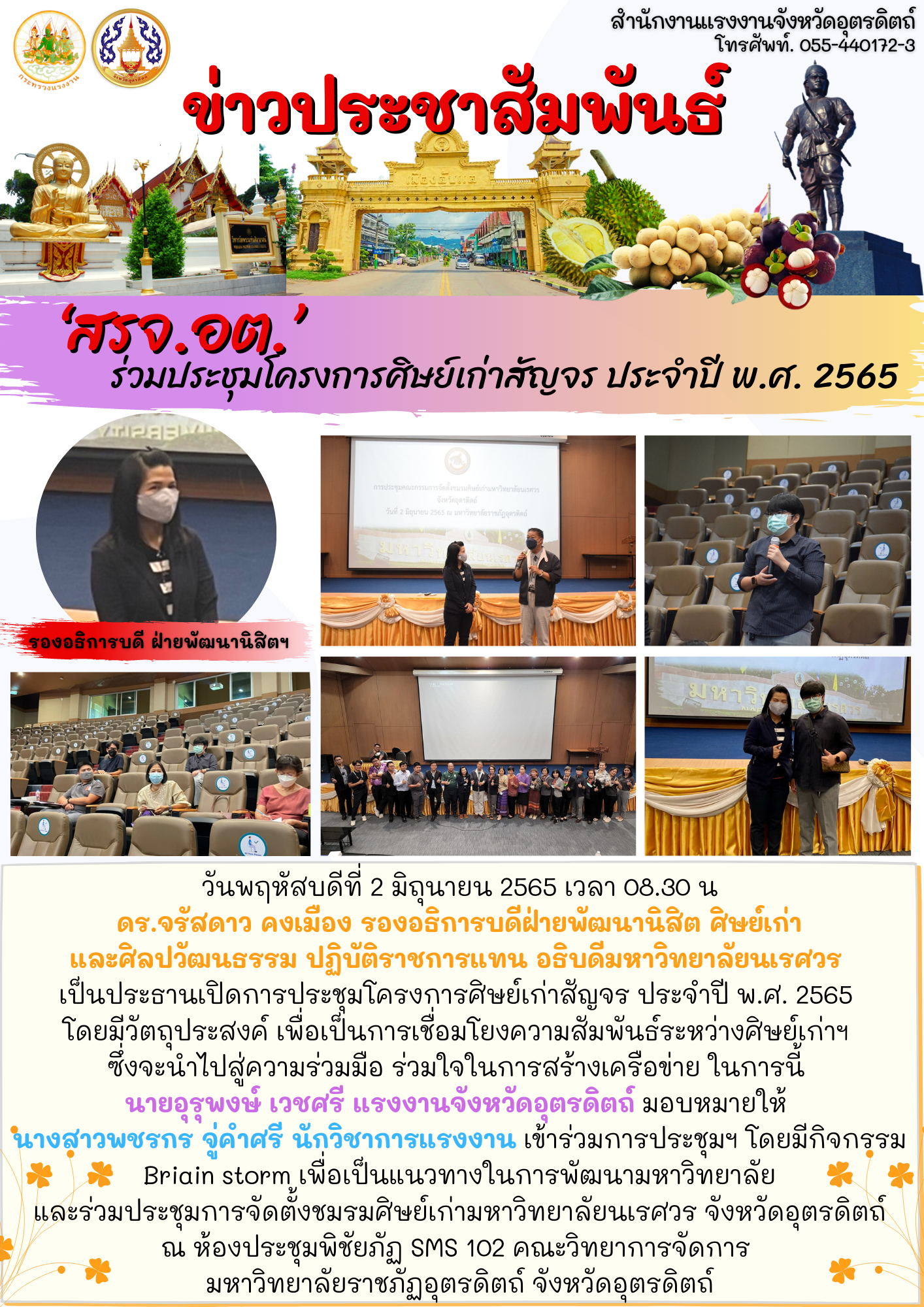 วันพฤหัสบดีที่ 2 มิถุนายน 2565 เวลา 08.30 น. ดร.จรัสดาว คงเมือง รองอธิการบดีฝ่ายพัฒนานิสิต ศิษย์เก่าและศิลปวัฒนธรรม ปฏิบัติราชการแทน อธิบดีมหาวิทยาลัยนเรศวรเป็นประธานเปิดการประชุมโครงการศิษย์เก่าสัญจร ประจำปี พ.ศ. 2565 โดยมีวัตถุประสงค์ เพื่อเป็นการเชื่อมโยงความสัมพันธ์ระหว่างศิษย์เก่าฯ ซึ่งจะนำไปสู่ความร่วมมือ ร่วมใจในการสร้างเครือข่าย ในการนี้ นายอุรุพงษ์ เวชศรี แรงงานจังหวัดอุตรดิตถ์ มอบหมายให้ นางสาวพชรกร จู่คำศรี นักวิชาการแรงงาน เข้าร่วมการประชุมฯ โดยมีกิจกรรม Briain storm เพื่อเป็นแนวทางในการพัฒนามหาวิทยาลัย และร่วมประชุมการจัดตั้งชมรมศิษย์เก่ามหาวิทยาลัยนเรศวร จังหวัดอุตรดิตถ์ ณ ห้องประชุมพิชัยภัฏ SMS 102 คณะวิทยาการจัดการ มหาวิทยาลัยราชภัฏอุตรดิตถ์ จังหวัดอุตรดิตถ์