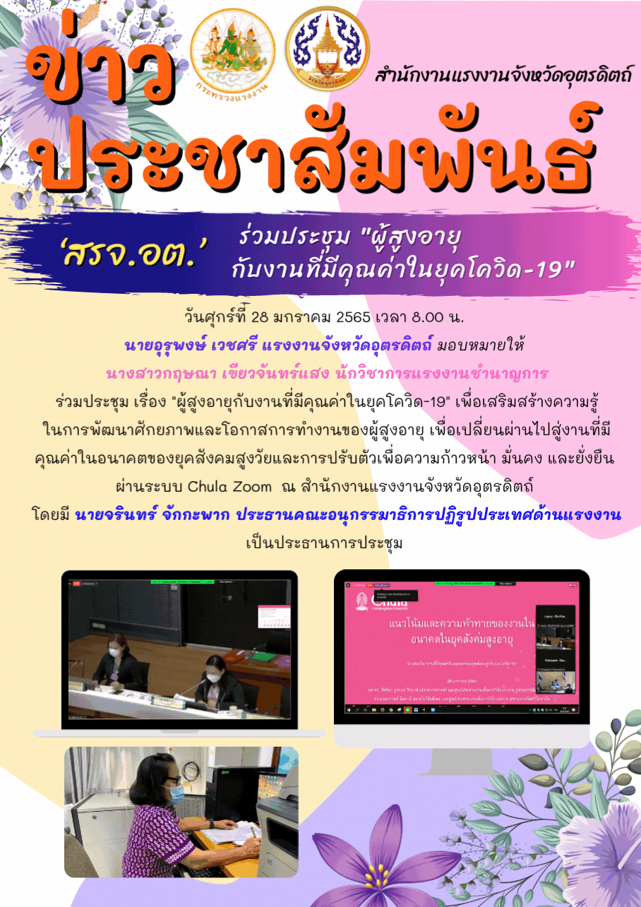 วันศุกร์ที่ 28 มกราคม 2565 เวลา 8.00 น. นายอุรุพงษ์ เวชศรี แรงงานจังหวัดอุตรดิตถ์ มอบหมายให้ นางสาวกฤษณา เขียวจันทร์แสง นักวิชาการแรงงานชำนาญการ ร่วมประชุม เรื่อง “ผู้สูงอายุกับงานที่มีคุณค่าในยุคโควิด-19” เพื่อเสริมสร้างความรู้ในการพัฒนาศักยภาพและโอกาสการทำงานของผู้สูงอายุ เพื่อเปลี่ยนผ่านไปสู่งานที่มีคุณค่าในอนาคตของยุคสังคมสูงวัยและการปรับตัวเพื่อความก้าวหน้า มั่นคง และยั่งยืน ผ่านระบบ Chula Zoom ณ สำนักงานแรงงานจังหวัดอุตรดิตถ์ โดยมี นายจรินทร์ จักกะพาก ประธานคณะอนุกรรมาธิการปฏิรูปประเทศด้านแรงงาน เป็นประธานการประชุม