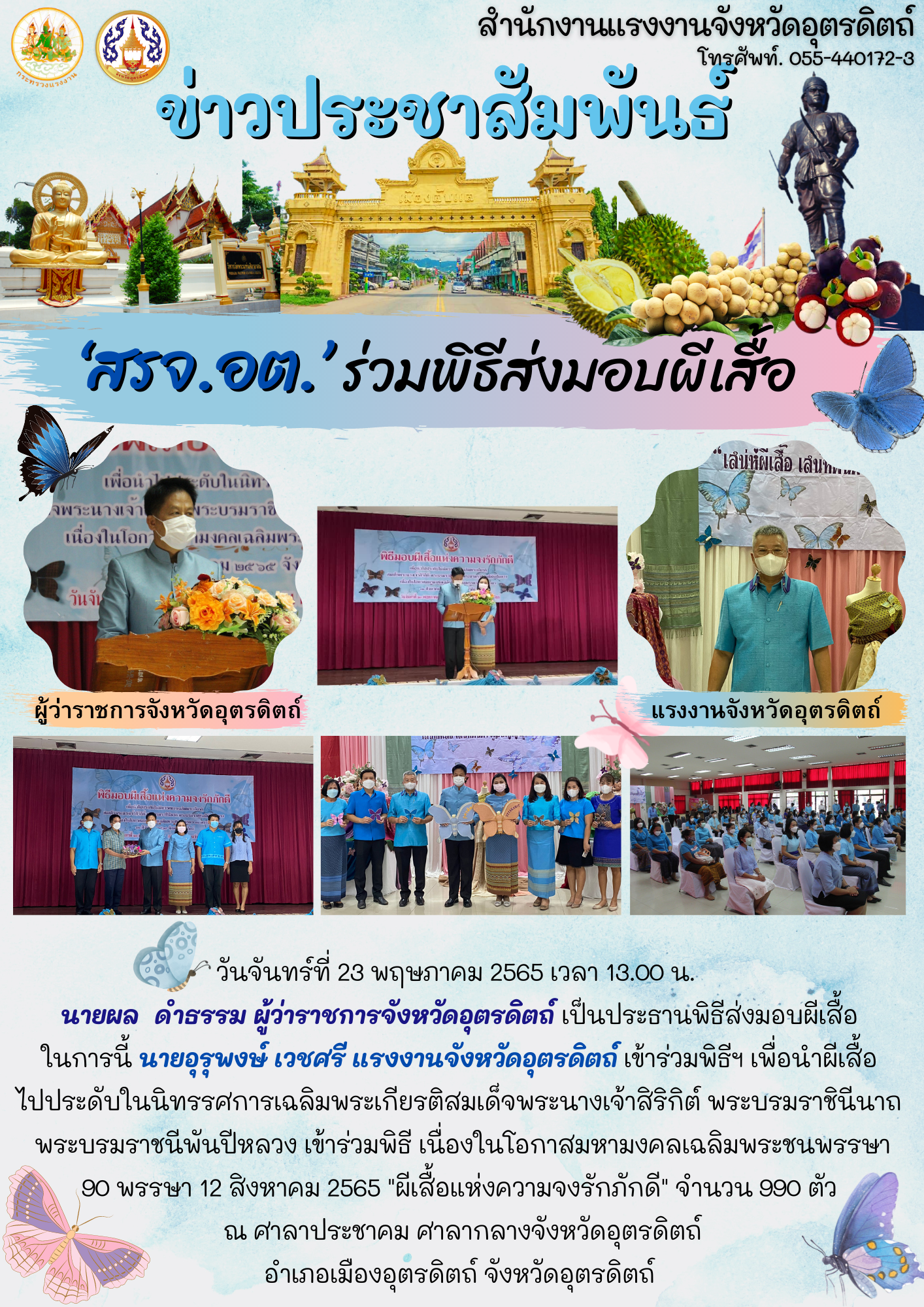 วันจันทร์ที่ 23 พฤษภาคม 2565 เวลา 13.00 น. นายผล ดำธรรม ผู้ว่าราชการจังหวัดอุตรดิตถ์ เป็นประธานพิธีส่งมอบผีเสื้อ ในการนี้ นายอุรุพงษ์ เวชศรี แรงงานจังหวัดอุตรดิตถ์ เข้าร่วมพิธีฯ เพื่อนำผีเสื้อไปประดับในนิทรรศการเฉลิมพระเกียรติสมเด็จพระนางเจ้าสิริกิต์ พระบรมราชินีนาถพระบรมราชนีพันปีหลวง เข้าร่วมพิธี เนื่องในโอกาสมหามงคลเฉลิมพระชนพรรษา 90 พรรษา 12 สิงหาคม 2565 “ผีเสื้อแห่งความจงรักภักดี” จำนวน 990 ตัว ณ ศาลาประชาคม ศาลากลางจังหวัดอุตรดิตถ์ อำเภอเมืองอุตรดิตถ์ จังหวัดอุตรดิตถ์