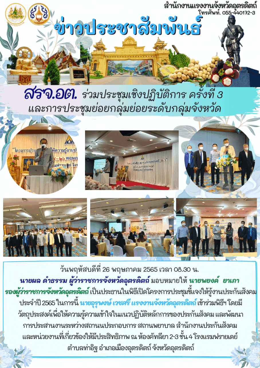 วันพฤหัสบดีที่ 26 พฤษภาคม 2565 เวลา 08.30 น. นายผล ดำธรรม ผู้ว่าราชการจังหวัดอุตรดิตถ์ มอบหมายให้ นายพยงค์ ยาเภา รองผู้ว่าราชการจังหวัดอุตรดิตถ์ เป็นประธานในพิธีเปิดโครงการประชุมชี้แจงให้รู้งานประกันสังคม ประจำปี 2565 ในการนี้ นายอุรุพงษ์ เวชศรี แรงงานจังหวัดอุตรดิตถ์ ร่วมพิธีเปิดการประชุมฯโดยมีวัตถุประสงค์เพื่อให้ความรู้ความเข้าใจในแนวปฏิบัติหลักการของประกันสังคม และพัฒนาการประสานงานระหว่างสถานนประกอบการ สถานพยาบาล สำนักงานประกันสังคม และหน่วยงานที่เกี่ยวข้องให้มีประสิทธิภาพ ณ ห้องคัทลียา 2-3 ชั้น 4 โรงแรมฟรายเดย์ ตำบลท่าอิฐ อำเภอเมืองอุตรดิตถ์ จังหวัดอุตรดิตถ์
