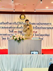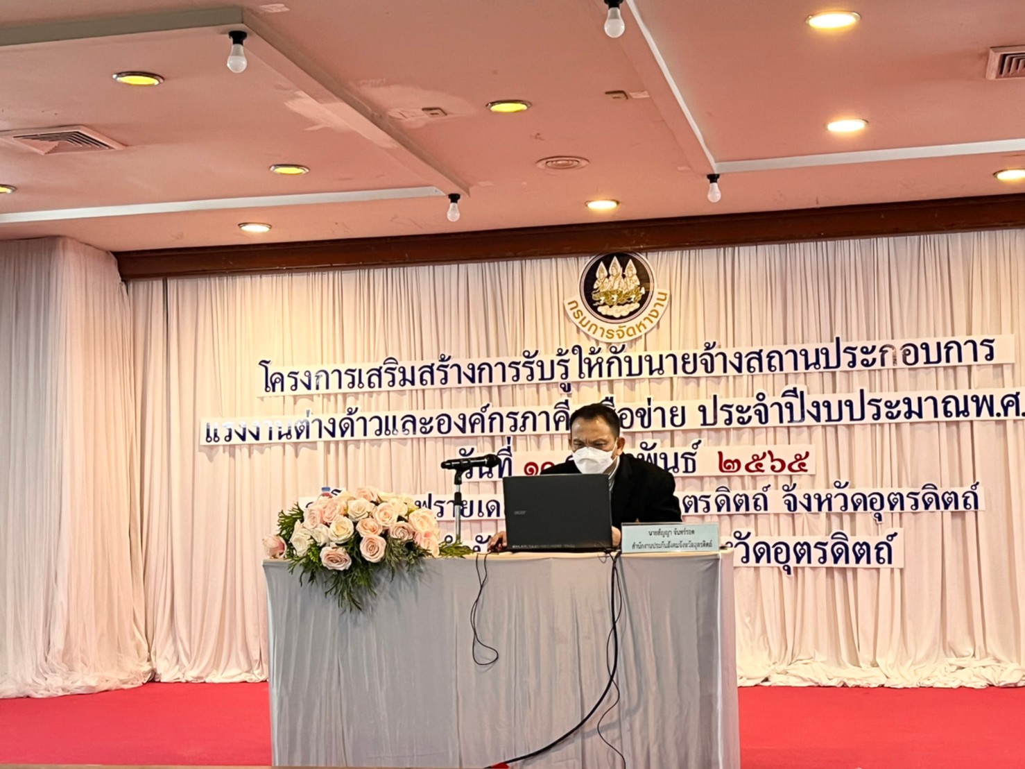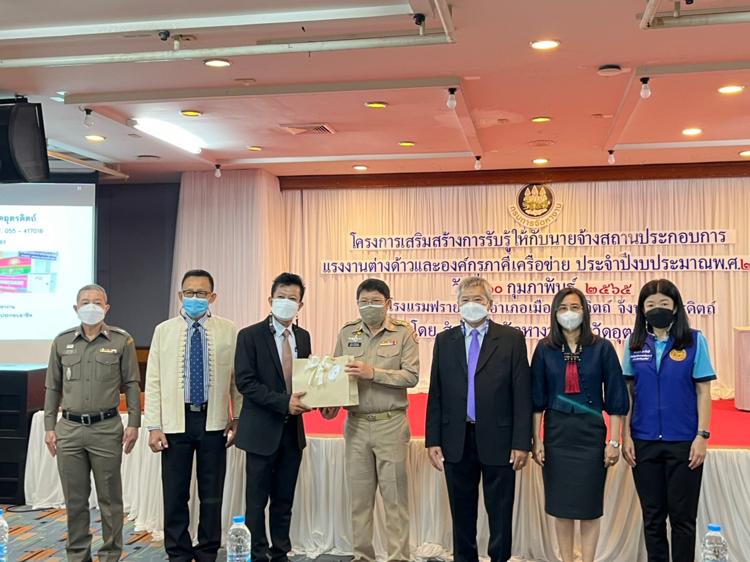 วันพฤหัสบดีที่ 10 กุมภาพันธ์ 2565 เวลา 09.00 น. นายอุรุพงษ์ เวชศรี แรงงานจังหวัดอุตรดิตถ์ ร่วมพิธีเปิดการอบรบโครงการเสริมสร้างการรับรู้ให้กับนายจ้าง สถานประกอบการ แรงงานต่างด้าวและองค์กรภาคีเครือข่าย ประจำปีงบประมาณ พ.ศ.2565 เพื่อให้กลุ่มเป้าหมายมีความรู้ ความเข้าใจในกฏระเบียบ ข้อกฏหมาย และขั้นตอนในการขอรับใบอนุญาตทำงานของคนต่างด้าว รวมถึงบทลงโทษตามพระราชกำหนดการบริหารจัดการการทำงานของคนต่างด้าว พ.ศ.2560 และที่แก้ไขเพิ่มเติม (ฉบับที่ 2) พ.ศ.2561 จัดโดยสำนักงานจัดหางานจังหวัดอุตรดิตถ์ ณ ห้องคัทลียา ชั้น 4 โรงแรมฟรายเดย์ อำเภอเมืองอุตรดิตถ์ จังหวัดอุตรดิตถ์ โดยมี นายสหวิช อภิชัยวิศรุตกุล รองผู้ว่าราชการจังหวัดอุตรดิตถ์ เป็นประธานในพิธีฯ