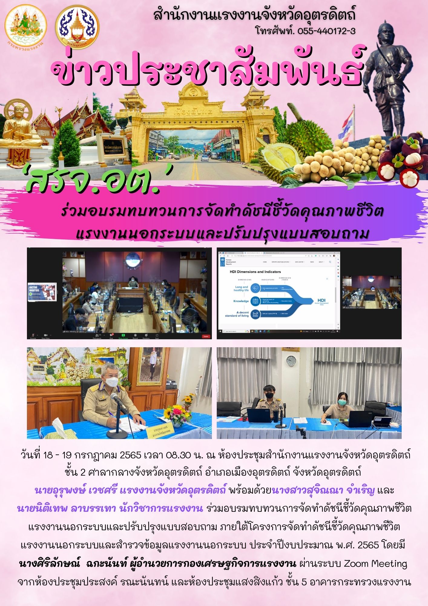 วันที่ 18 – 19 กรกฎาคม 2565 เวลา 08.30 น. ณ ห้องประชุมสำนักงานแรงงานจังหวัดอุตรดิตถ์ ชั้น 2 ศาลากลางจังหวัดอุตรดิตถ์ อำเภอเมืองอุตรดิตถ์ จังหวัดอุตรดิตถ์ นายอุรุพงษ์ เวชศรี แรงงานจังหวัดอุตรดิตถ์ พร้อมด้วยนางสาวสุจิณณา จำเริญ และนายนิติเทพ ลาบรรเทา นักวิชาการแรงงาน ร่วมอบรมทบทวนการจัดทำดัชนีชี้วัดคุณภาพชีวิตแรงงานนอกระบบและปรับปรุงแบบสอบถาม ภายใต้โครงการจัดทำดัชนีชี้วัดคุณภาพชีวิต แรงงานนอกระบบและสำรวจข้อมูลแรงงานนอกระบบ ประจำปีงบประมาณ พ.ศ. 2565 โดยมี นางศิริลักษณ์ ฉกะนันท์ ผู้อำนวยการกองเศรษฐกิจการแรงงาน ผ่านระบบ Zoom Meeting จากห้องประชุมประสงค์ รณะนันทน์ และห้องประชุมแสงสิงแก้ว ชั้น 5 อาคารกระทรวงแรงงาน