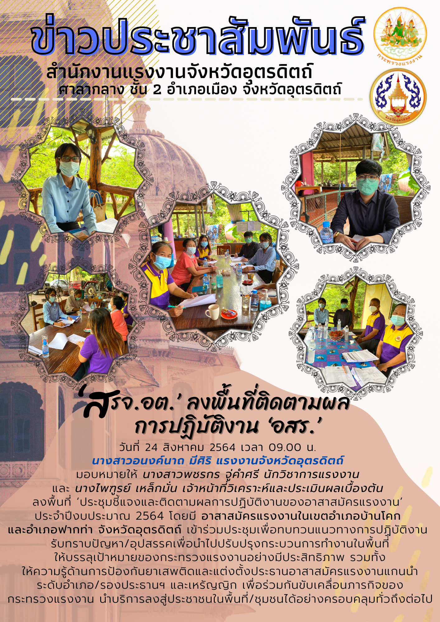 วันอังคารที่ 24 สิงหาคม 2564 เวลา 09.00 น. นางสาวอนงค์นาถ มีศิริ แรงงานจังหวัดอุตรดิตถ์ มอบหมายให้ นางสาวพชรกร จู่คำศรี นักวิชาการแรงงาน และ นางไพฑูรย์ เหล็กมั่น เจ้าหน้าที่วิเคราะห์และประเมินผลเบื้องต้น ลงพื้นที่ ‘ประชุมชี้แจงและติดตามผลการปฏิบัติงานของอาสาสมัครแรงงาน’ ประจำปีงบประมาณ 2564 โดยมี อาสาสมัครแรงงานในเขตอำเภอบ้านโคก และอำเภอฟากท่า จังหวัดอุตรดิตถ์ เข้าร่วมประชุมเพื่อทบทวนแนวทางการปฏิบัติงาน รับทราบปัญหา/อุปสรรค เพื่อนำไปปรับปรุงกระบวนการทำงานในพื้นที่ให้บรรลุเป้าหมายของกระทรวงแรงงานอย่างมีประสิทธิภาพ รวมทั้งให้ความรู้ด้านการป้องกันยาเสพติดและแต่งตั้งประธานอาสาสมัครแรงงานแกนนำระดับอำเภอ/รองประธานฯ และเหรัญญิก เพื่อร่วมกันขับเคลื่อนภารกิจของกระทรวงแรงงาน นำบริการลงสู่ประชาชนในพื้นที่/ชุมชนได้อย่างครอบคลุมทั่วถึงต่อไป