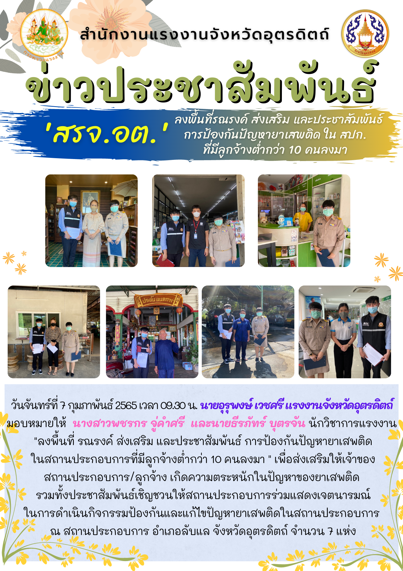 วันจันทร์ที่ 7 กุมภาพันธ์ 2565 เวลา 09.30 น. นายอุรุพงษ์ เวชศรี แรงงานจังหวัดอุตรดิตถ์มอบหมายให้ นางสาวพชรกร จู่คำศรี และนายธีรภัทร์ บุตรจัน นักวิชาการแรงงาน“ลงพื้นที่ รณรงค์ ส่งเสริม และประชาสัมพันธ์ การป้องกันปัญหายาเสพติดในสถานประกอบการที่มีลูกจ้างต่ำกว่า 10 คนลงมา ” เพื่อส่งเสริมให้เจ้าของสถานประกอบการ/ลูกจ้าง เกิดความตระหนักในปัญหาของยาเสพติดรวมทั้งประชาสัมพันธ์เชิญชวนให้สถานประกอบการร่วมแสดงเจตนารมณ์ในการดำเนินกิจกรรมป้องกันและแก้ไขปัญหายาเสพติดในสถานประกอบการณ สถานประกอบการ อำเภอลับแล จังหวัดอุตรดิตถ์ จำนวน 7 แห่ง