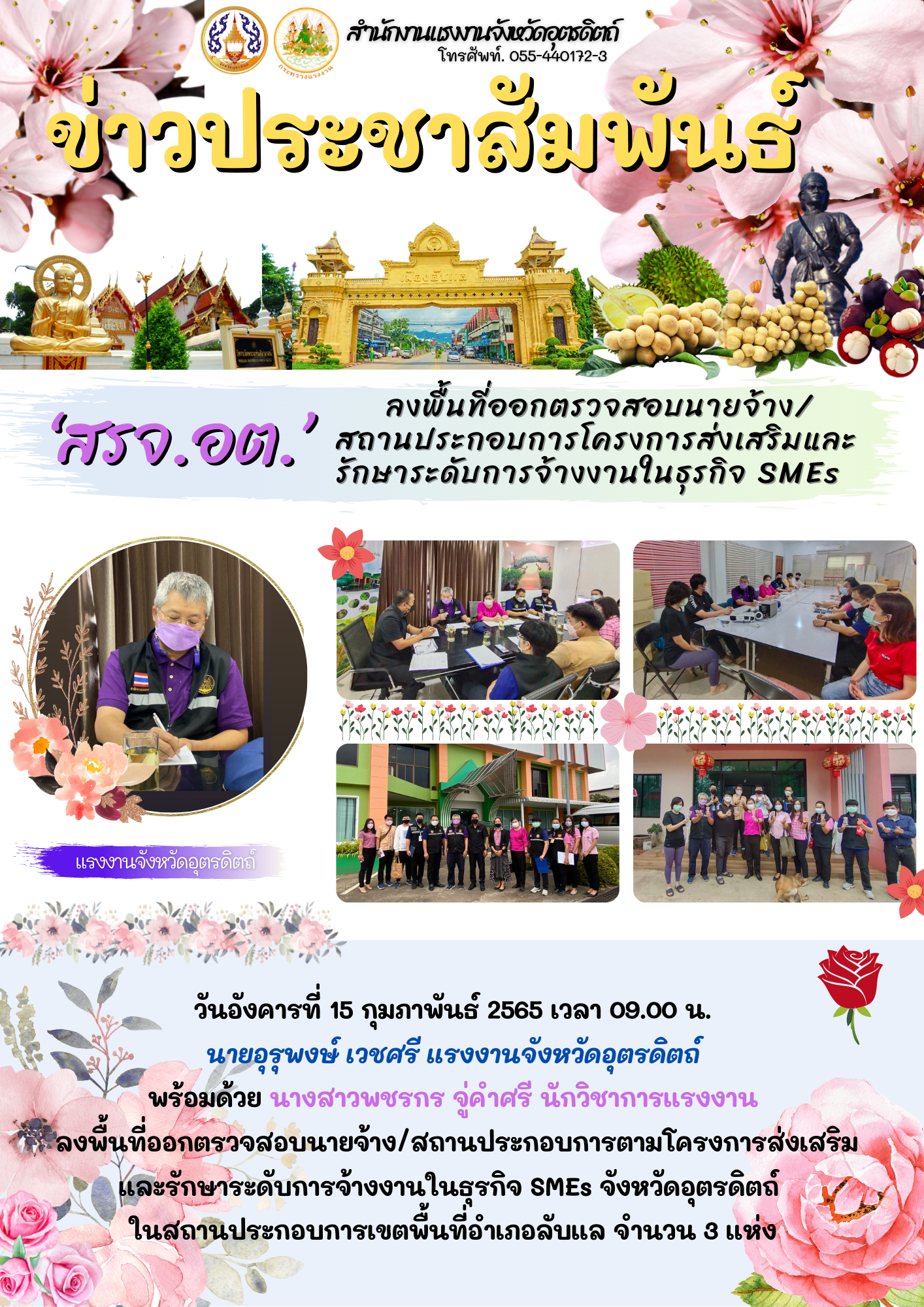 วันอังคารที่ 15 กุมภาพันธ์ 2565 เวลา 09.00 น. นายอุรุพงษ์ เวชศรี แรงงานจังหวัดอุตรดิตถ์ พร้อมด้วย นางสาวพชรกร จู่คำศรี นักวิชาการแรงงาน ลงพื้นที่ออกตรวจสอบนายจ้าง/สถานประกอบการ ตามโครงการส่งเสริม และรักษาระดับการจ้างงานในธุรกิจ SMEs จังหวัดอุตรดิตถ์ในสถานประกอบการเขตพื้นที่อำเภอลับแล จำนวน 3 แห่ง