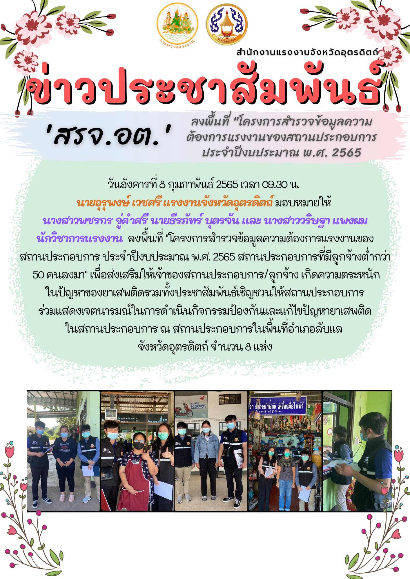 วันอังคารที่ 8 กุมภาพันธ์ 2565 เวลา 09.30 น. นายอุรุพงษ์ เวชศรี แรงงานจังหวัดอุตรดิตถ์ มอบหมายให้นางสาวพชรกร จู่คำศรี นายธีรภัทร์ บุตรจัน และ นางสาววริษฐา แพงผม นักวิชาการแรงงาน ลงพื้นที่ “โครงการสำรวจข้อมูลความต้องการแรงงานของสถานประกอบการ ประจำปีงบประมาณ พ.ศ. 2565 สถานประกอบการที่มีลูกจ้างต่ำกว่า50 คนลงมา” เพื่อส่งเสริมให้เจ้าของสถานประกอบการ/ลูกจ้างเกิดความตระหนักในปัญหาของยาเสพติดรวมทั้งประชาสัมพันธ์เชิญชวนให้สถานประกอบการร่วมแสดงเจตนารมณ์ในการดำเนินกิจกรรมป้องกันและแก้ไขปัญหายาเสพติดในสถานประกอบการ ณ สถานประกอบการในพื้นที่อำเภอลับแลจังหวัดอุตรดิตถ์ จำนวน 8 แห่ง