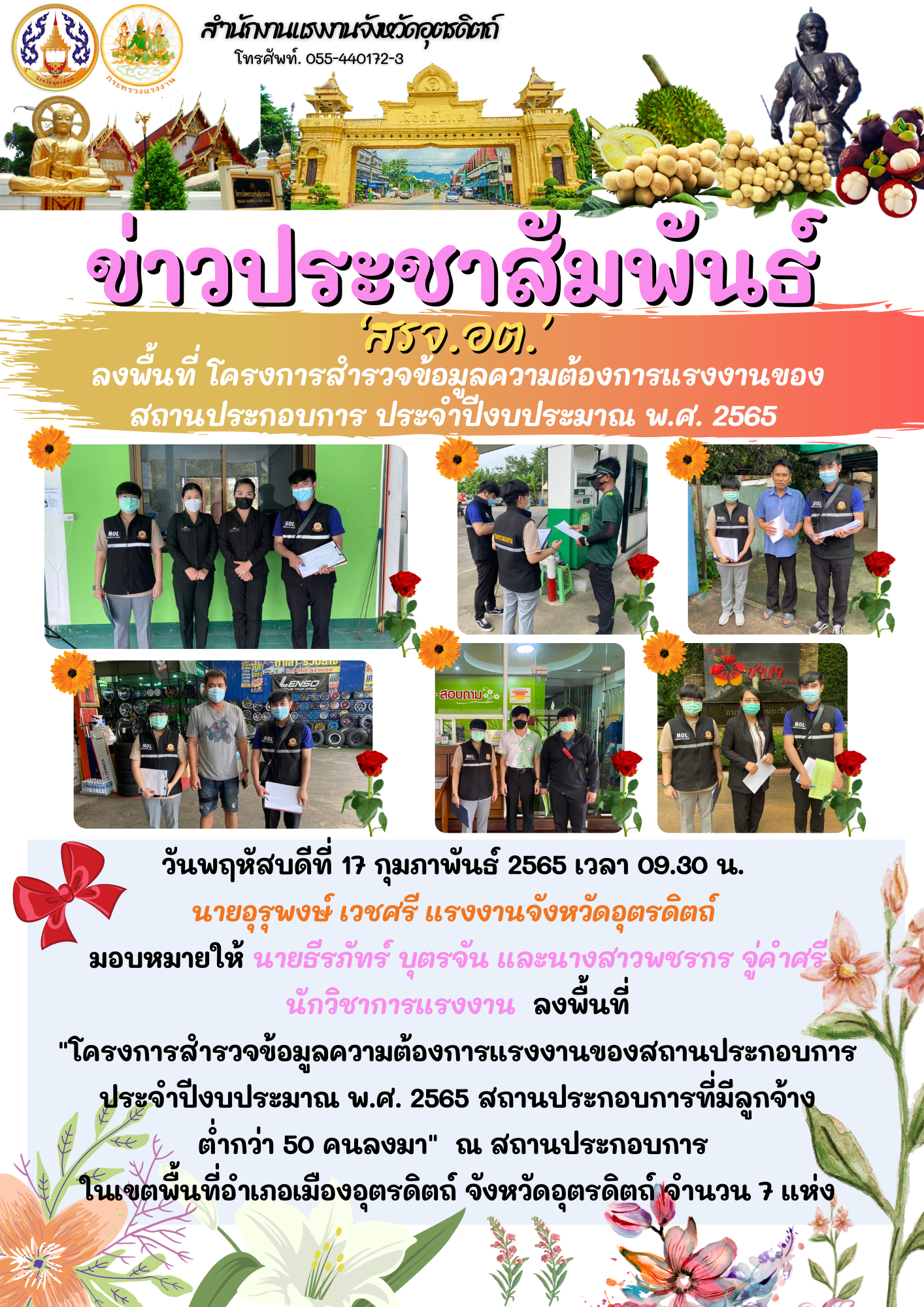 วันพฤหัสบดีที่ 17 กุมภาพันธ์ 2565 เวลา 09.30 น. นายอุรุพงษ์ เวชศรี แรงงานจังหวัดอุตรดิตถ์ มอบหมายให้ นายธีรภัทร์ บุตรจัน และนางสาวพชรกร จู่คำศรี นักวิชาการแรงงาน ลงพื้นที่ “โครงการสำรวจข้อมูลความต้องการแรงงานของสถานประกอบการ ประจำปีงบประมาณ พ.ศ. 2565 สถานประกอบการที่มีลูกจ้าง ต่ำกว่า 50 คนลงมา” ณ สถานประกอบการ ในเขตพื้นที่อำเภอเมืองอุตรดิตถ์ จังหวัดอุตรดิตถ์ จำนวน 7 แห่ง