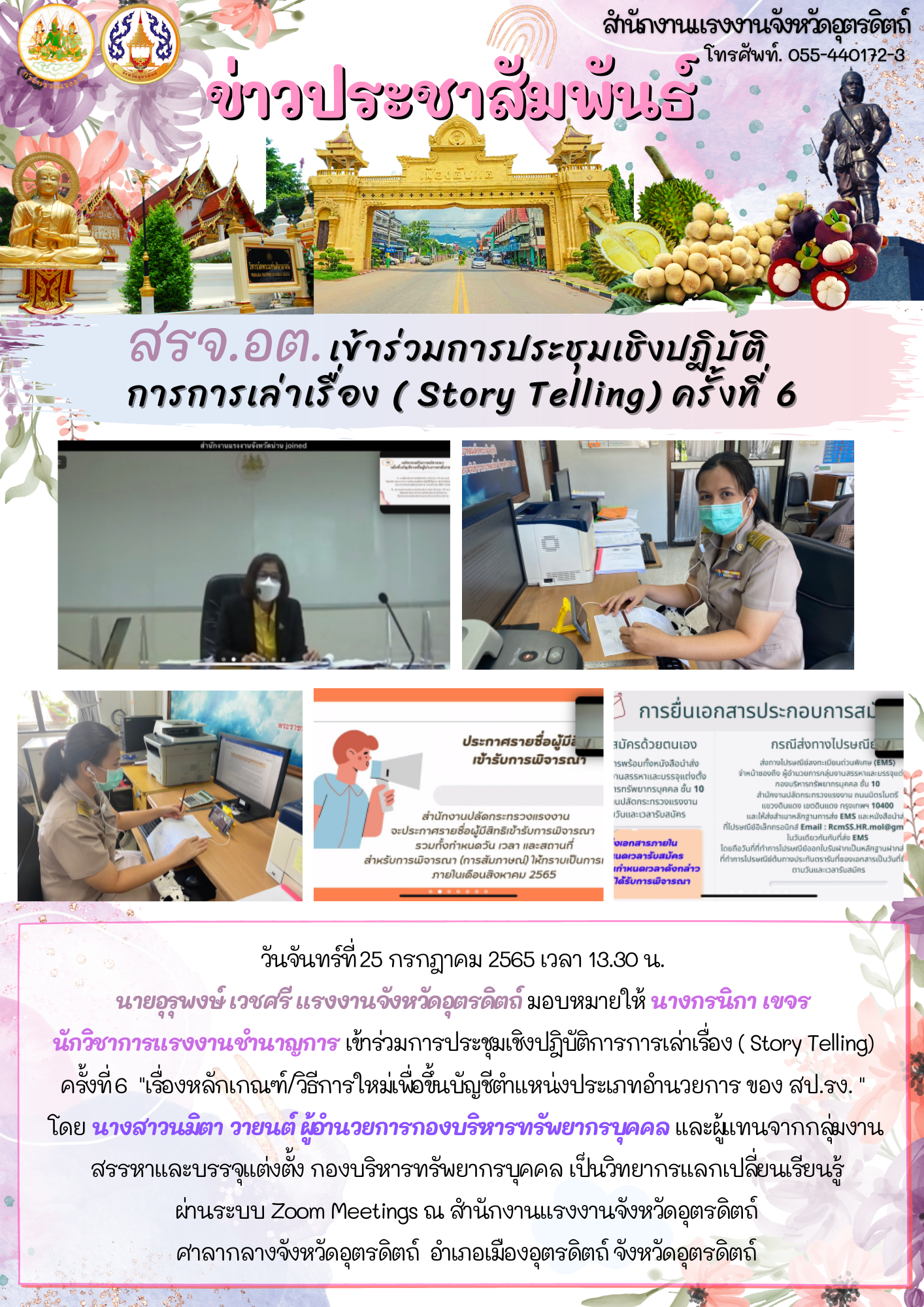 วันจันทร์ที่ 25 กรกฎาคม 2565 เวลา 13.30 น. นายอุรุพงษ์ เวชศรี แรงงานจังหวัดอุตรดิตถ์ มอบหมายให้ นางกรนิกา เขจร นักวิชาการแรงงานชำนาญการ เข้าร่วมการประชุมเชิงปฎิบัติการการเล่าเรื่อง ( Story Telling) ครั้งที่ 6 “เรื่องหลักเกณฑ์/วิธีการใหม่เพื่อขึ้นบัญชีตำแหน่งประเภทอำนวยการ ของ สป.รง. ” โดย นางสาวนมิตา วายนต์ ผู้อำนวยการกองบริหารทรัพยากรบุคคล และผู้แทนจากกลุ่มงานสรรหาและบรรจุแต่งตั้ง กองบริหารทรัพยากรบุคคล เป็นวิทยากรแลกเปลี่ยนเรียนรู้ผ่านระบบ Zoom Meetings ณ สำนักงานแรงงานจังหวัดอุตรดิตถ์ศาลากลางจังหวัดอุตรดิตถ์ อำเภอเมืองอุตรดิตถ์ จังหวัดอุตรดิตถ์