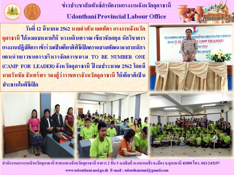 สรจ.อุดรธานี ร่วมพิธีเปิดการอบรมพัฒนาอาสาสมัครแกนนำเยาวชนการบริการจัดการชมรม TO BE NUMBER ONE (CAMP FOR LEADER) จังหวัดอุดรธานี ปีงบประมาณ 2562