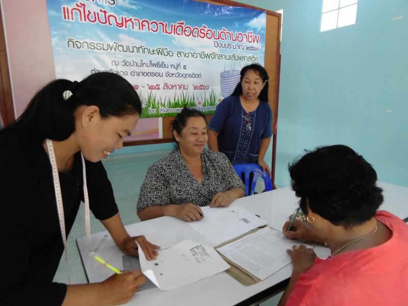 เมื่อวันศุกร์ที่ 25 สิงหาคม 2560 เวลา 10.00 น. นางสาวปาริชาติ สวนใจ แรงงานจังหวัดอุตรดิตถ์ มอบหมายนางสุเพ็ญ จิตต์ใจฉ่ำ เจ้าพนักงานการเงินและบัญชีชำนาญงาน ติดตามผลการดำเนินงานกิจกรรมพัฒนาทักษะฝีมือ สาขาจักสานเส้นพลาสติก พร้อมจ่ายเบี้ยเลี้ยงผู้เข้ารับการฝึก ณ บ้านใหม่โพธิ์เย็น ม.5 ต.วังแดง อ.ตรอน รายได้เฉลี่ยต่อคนๆ ละ 600 บาท