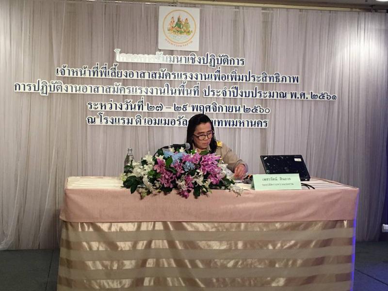 เมื่อวันจันทร์ที่ 27-วันพุธที่ 29 พฤศจิกายน 2560 นางสาวปาริชาติ สวนใจ แรงงานจังหวัดอุตรดิตถ์ มอบหมายนางสาวกฤษณา เขียวจันทร์แสง นักวิชาการแรงงานชำนาญการ เข้าร่วมการสัมมาเชิงปฏิบัติการเจ้าหน้าที่พี่เลี้ยงอาสาสมัครแรงงานเพื่อเพิ่มประสิทธิภาพการปฎิบัติงานอาสาสมัครแรงงานในพื้นที่ ณ โรงแรมดิเอมเมอรัล รัชดาภิเษก กรุงเทพมหานคร โดยนางเพชรรัตน์ สินอวย รองปลัดกระทรวงแรงงาน เป็นประธานพิธีเปิด