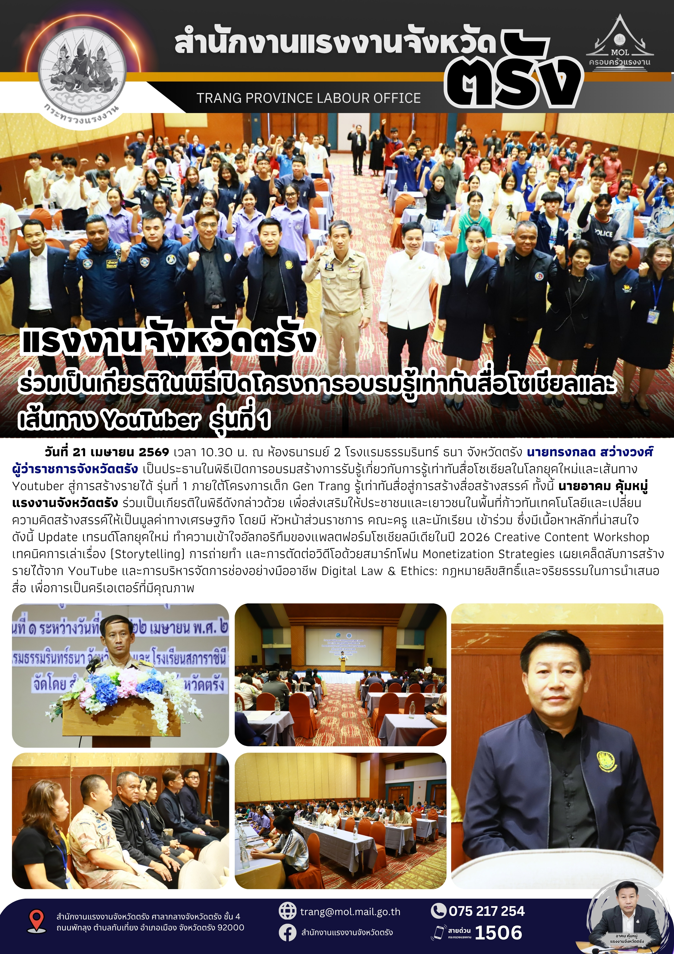 แรงงานจังหวัดตรัง ร่วมเป็นเกียรติในพิธีเปิดโครงการอบรมรู้เท่าทันสื่อโซเชียลและเส้นทาง YouTuber รุ่นที่ 1