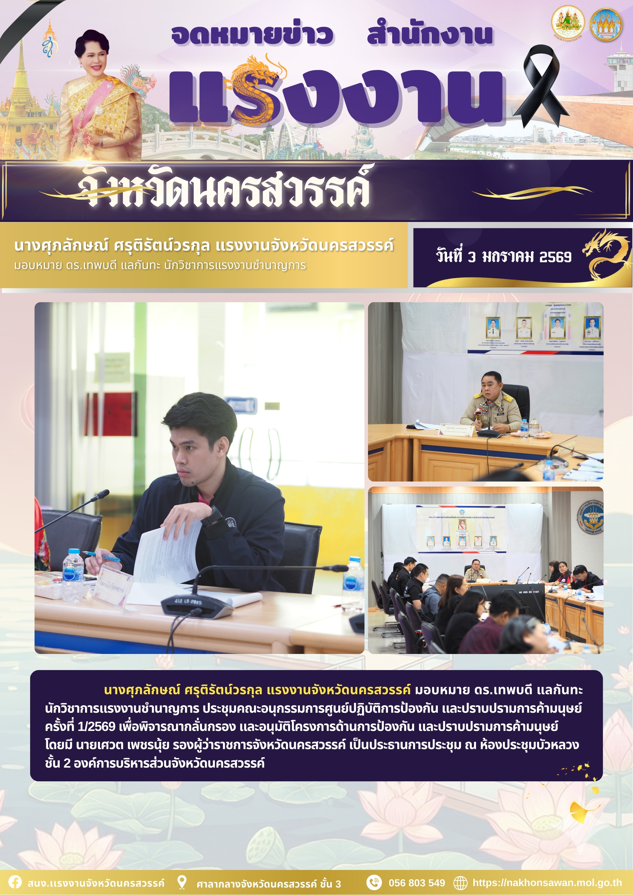 นางศุภลักษณ์ ศรุติรัตน์วรกุล แรงงานจังหวัดนครสวรรค์ มอบหมาย ดร.เทพบดี แลกันทะ นักวิชาการแรงงานชำนาญการ ประชุมคณะอนุกรรมการศูนย์ปฏิบัติการป้องกัน และปราบปรามการค้ามนุษย์ ครั้งที่ 1/2569 เพื่อพิจารณากลั่นกรอง และอนุมัติโครงการด้านการป้องกัน และปราบปรามการค้ามนุษย์ โดยมี นายเศวต เพชรนุ้ย รองผู้ว่าราชการจังหวัดนครสวรรค์ เป็นประธานการประชุม ณ ห้องประชุมบัวหลวง ชั้น 2 องค์การบริหารส่วนจังหวัดนครสวรรค์