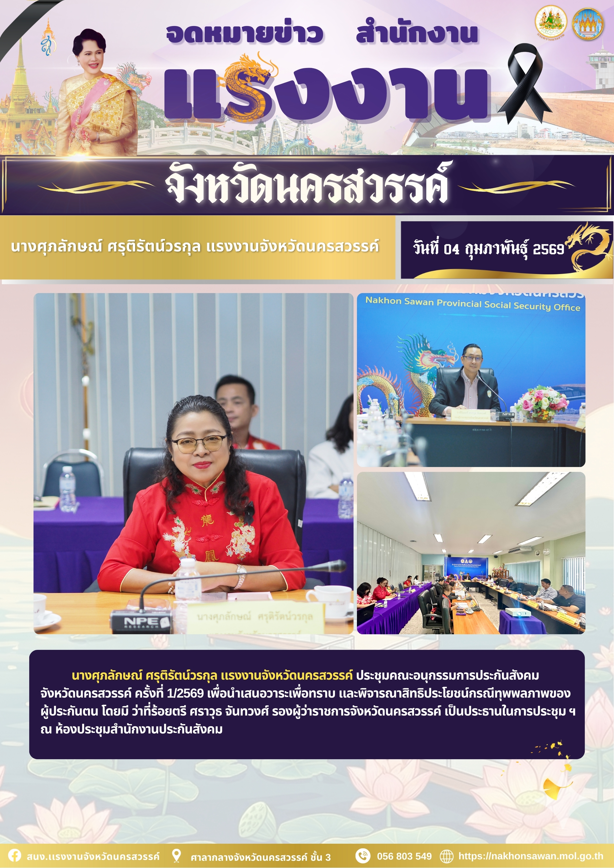 นางศุภลักษณ์ ศรุติรัตน์วรกุล แรงงานจังหวัดนครสวรรค์ ประชุมคณะอนุกรรมการประกันสังคม จังหวัดนครสวรรค์ ครั้งที่ 1/2569 เพื่อนำเสนอวาระเพื่อทราบ และพิจารณาสิทธิประโยชน์กรณีทุพพลภาพของผู้ประกันตน โดยมี ว่าที่ร้อยตรี ศราวุธ จันทวงศ์ รองผู้ว่าราชการจังหวัดนครสวรรค์ เป็นประธานในการประชุม ฯ ณ ห้องประชุมสำนักงานประกันสังคม