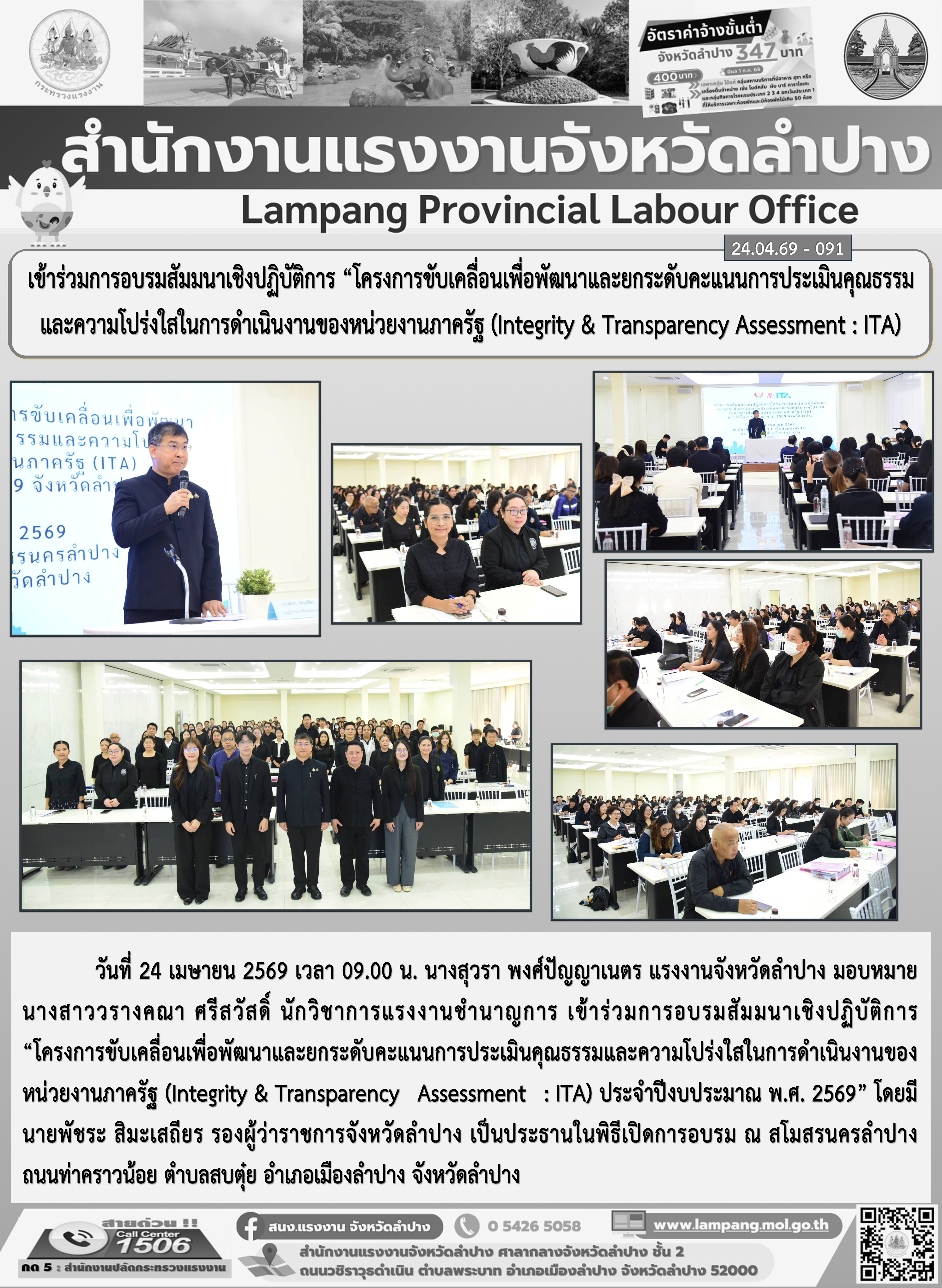 เข้าร่วมการอบรมสัมมนาเชิงปฏิบัติการ “โครงการขับเคลื่อนเพื่อพัฒนาและยกระดับคะแนนการประเมินคุณธรรมและความโปร่งใสในการดำเนินงานของหน่วยงานภาครัฐ (Integrity & Transparency Assessment : ITA) ประจำปีงบประมาณ พ.ศ. 2569”