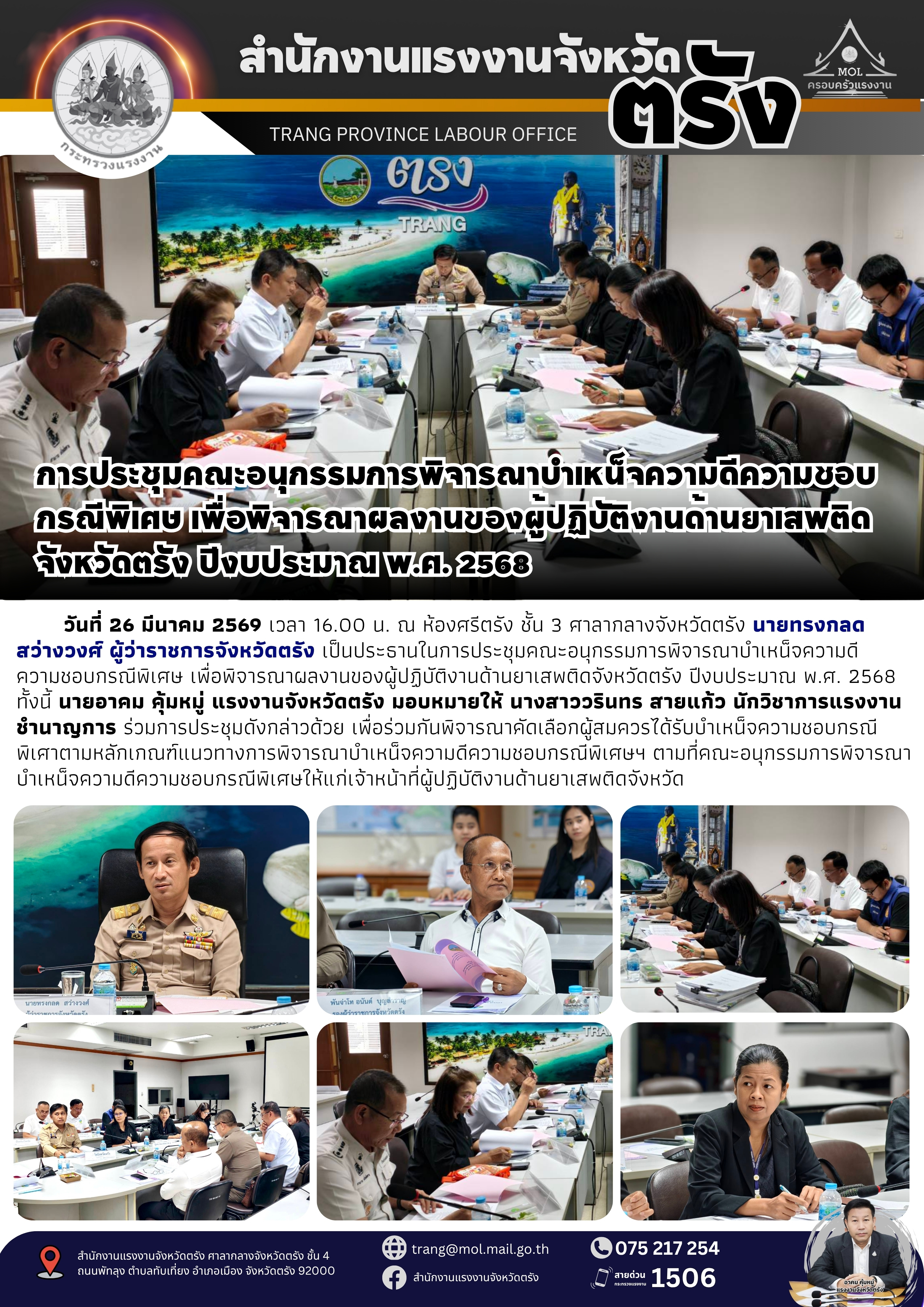 สรจ.ตรัง ร่วมการประชุมคณะอนุกรรมการพิจารณาบำเหน็จความดีความชอบกรณีพิเศษ เพื่อพิจารณาผลงานของผู้ปฏิบัติงานด้านยาเสพติดจังหวัดตรัง ปีงบประมาณ พ.ศ. 2568