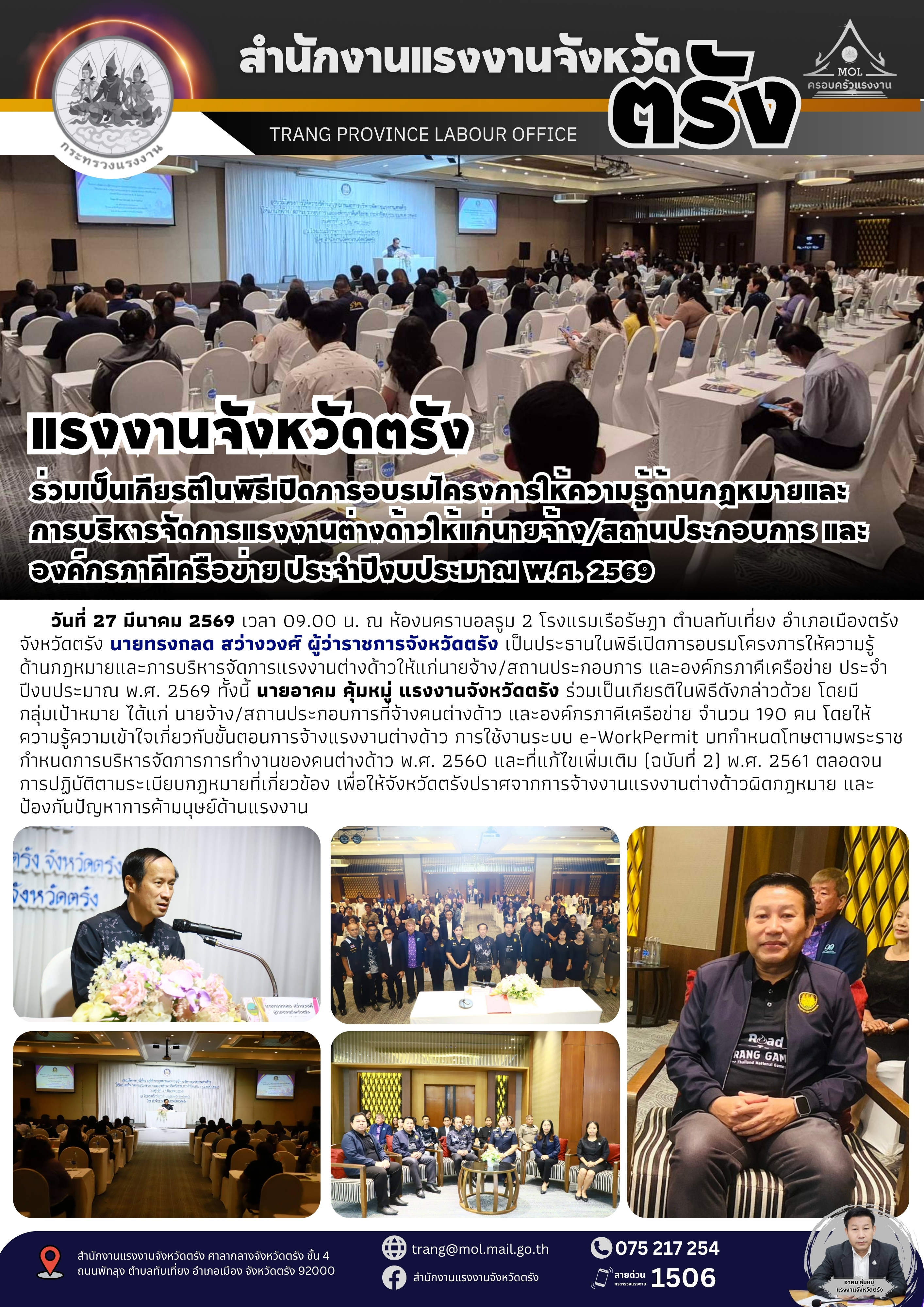 แรงงานจังหวัดตรัง ร่วมเป็นเกียรติในพิธีเปิดการอบรมโครงการให้ความรู้ด้านกฎหมายและ การบริหารจัดการแรงงานต่างด้าวให้แก่นายจ้าง/สถานประกอบการ และองค์กรภาคีเครือข่าย ประจำปีงบประมาณ พ.ศ. 2569