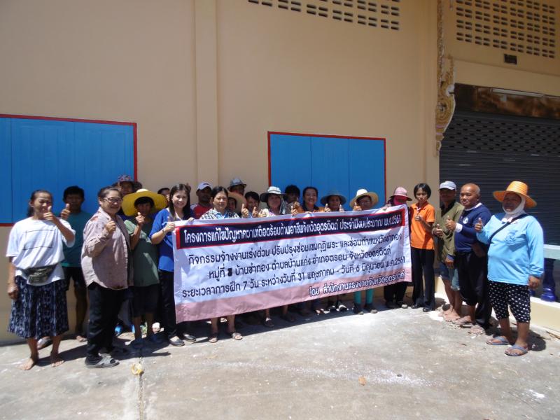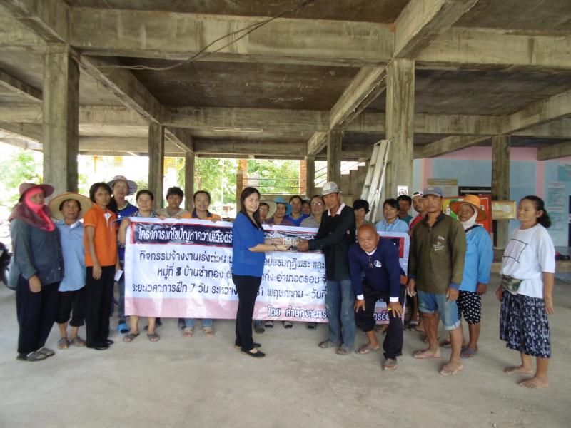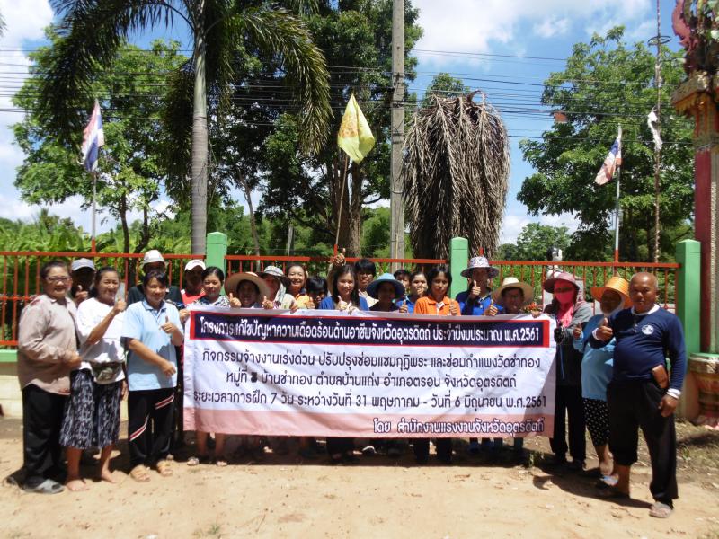 เมื่อวันพุธที่ 6 มิถุนายน 2561 เวลา 10.30 น. นางสาวปาริชาติ สวนใจ แรงงานจังหวัดอุตรดิตถ์ มอบหมายนางกรนิกา เขจร นักวิชาการแรงงานชำนาญการ ลงพื้นที่ปิดฝึกกิจกรรมจ้างงานเร่งด่วน ปรับปรุงซ่อมแซมกุฏิพระและซ่อมกำแพงวัดชำทอง ณ วัดชำทอง ม.8 ต.บ้านแก่ง อ.ตรอน จำนวน 22 คน รายได้เฉลี่ยคนละ 1,050 บาท
