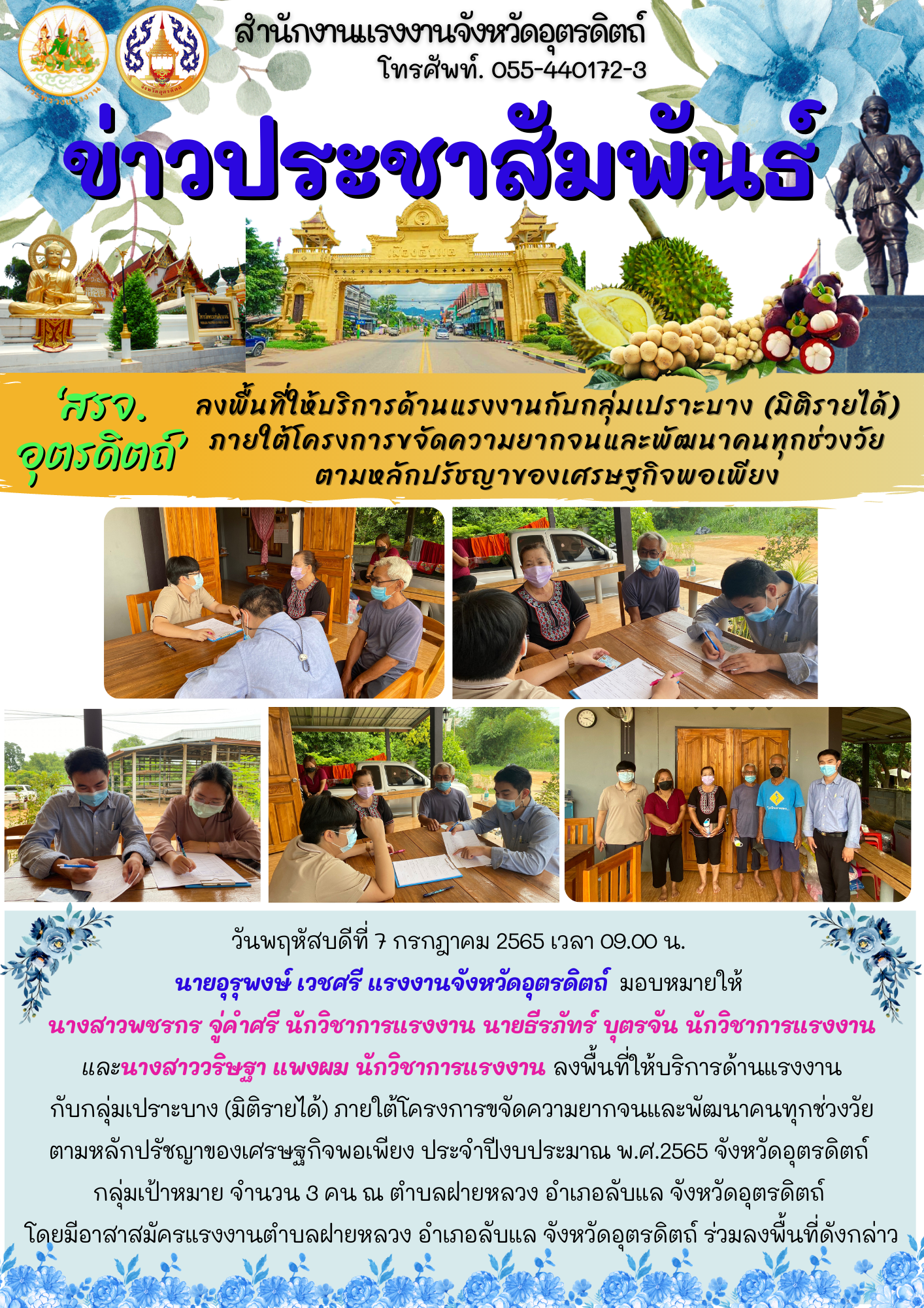 วันพฤหัสบดีที่ 7 กรกฎาคม 2565 เวลา 09.00 น. นายอุรุพงษ์ เวชศรี แรงงานจังหวัดอุตรดิตถ์ มอบหมายให้นางสาวพชรกร จู่คำศรี นักวิชาการแรงงาน นายธีรภัทร์ บุตรจัน นักวิชาการแรงงานและนางสาววริษฐา แพงผม นักวิชาการแรงงาน ลงพื้นที่ให้บริการด้านแรงงานกับกลุ่มเปราะบาง (มิติรายได้) ภายใต้โครงการขจัดความยากจนและพัฒนาคนทุกช่วงวัยตามหลักปรัชญาของเศรษฐกิจพอเพียง ประจำปีงบประมาณ พ.ศ.2565 จังหวัดอุตรดิตถ์ กลุ่มเป้าหมาย จำนวน 3 คน ณ ตำบลฝายหลวง อำเภอลับแล จังหวัดอุตรดิตถ์ โดยมีอาสาสมัครแรงงานตำบลฝายหลวง อำเภอลับแล จังหวัดอุตรดิตถ์ ร่วมลงพื้นที่ดังกล่าว