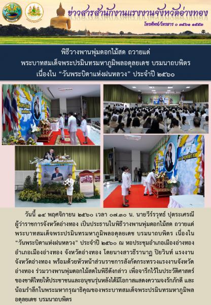 สรจ.อ่างทอง ร่วมพิธีวางพานพุ่มดอกไม้สด ถวายแด่ พระบาทสมเด็จพระปรมินทรมหาภูมิพลอดุลยเดช บรมนาถบพิตร เนื่องใน “วันพระบิดาแห่งฝนหลวง” ประจำปี 2560