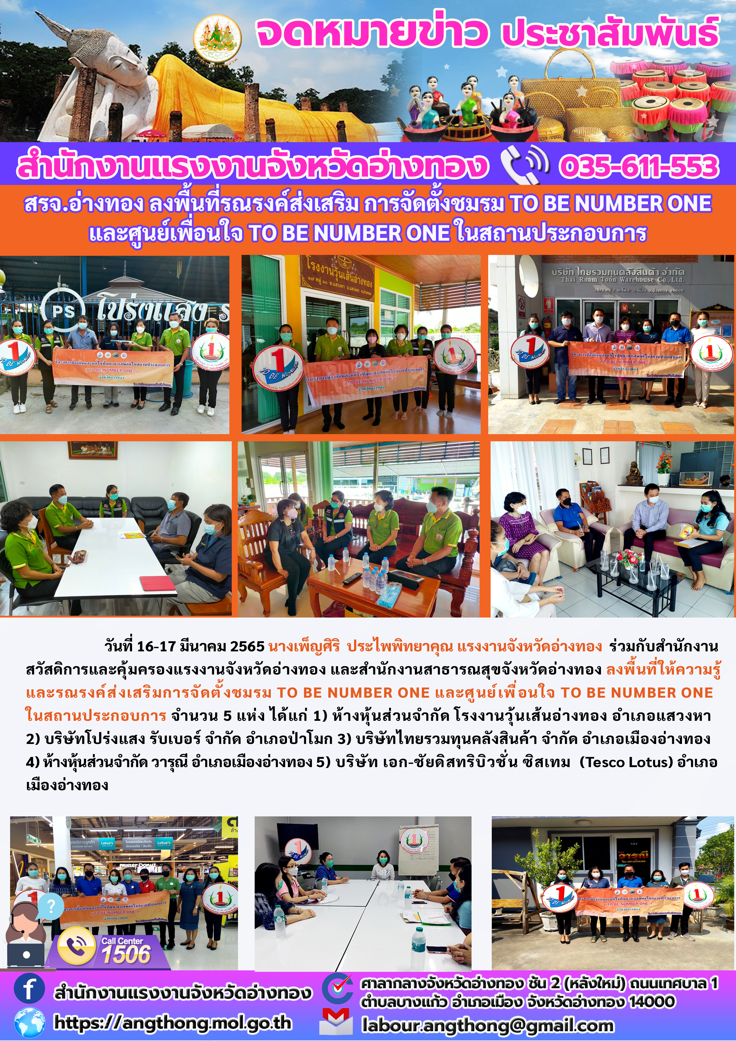 สรจ.อ่างทอง ลงพื้นที่รณรงค์ส่งเสริม การจัดตั้งชมรม TO BE NUMBER ONE และศูนย์เพื่อนใจ TO BE NUMBER ONE ในสถานประกอบการ