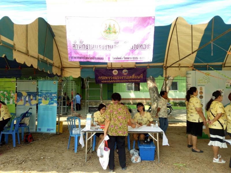 สำนักงานแรงงานจังหวัดอ่างทอง ได้ร่วมบูรณาการภารกิจของกระทรวงแรงงาน เพื่อให้บริการประชาชนโดยมีเจ้าหน้าที่คอยให้คำปรึกษาด้านแรงงานแจกเอกสารเพื่อประชาสัมพันธ์ภารกิจด้านต่างๆของสำนักงานแรงงาน ช่องการการติดต่อ ข้อมูลแนวทาง ในการประกอบอาชีพ ซึ่งมีผู้เข้าร่วมโครงการทั้งหน่วยงานภาครัฐ เอกชน และประชาชน