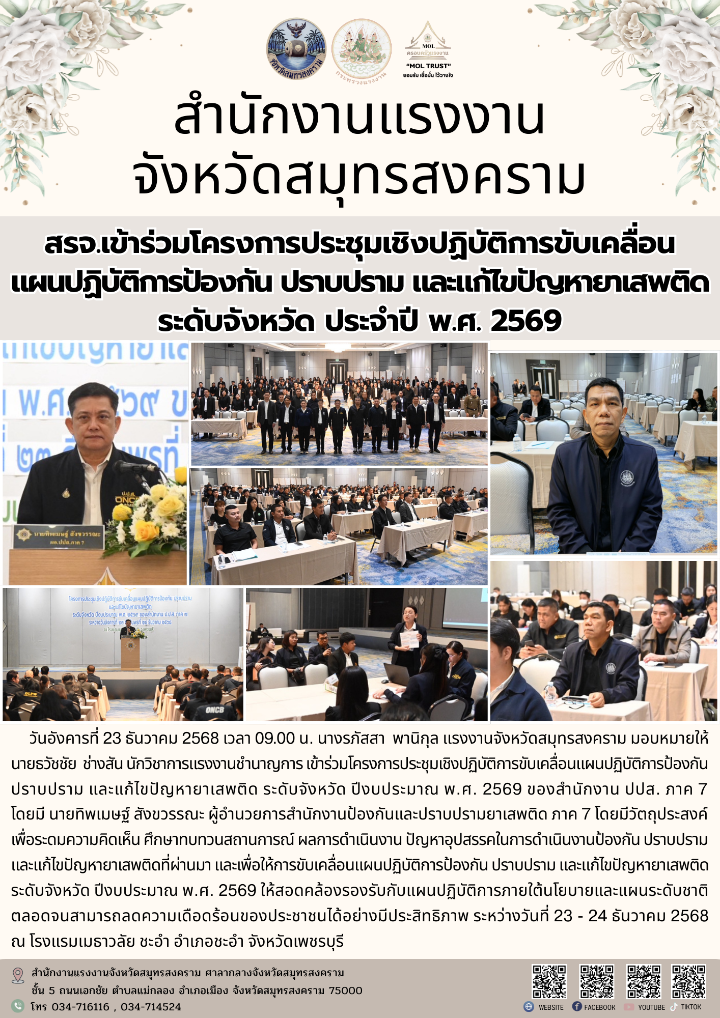 วันอังคารที่ 23 ธันวาคม 2568 เวลา 09.00 น. นางรภัสสา พานิกุล แรงงานจังหวัดสมุทรสงคราม มอบหมายให้ นายธวัชชัย ช่างสัน นักวิชาการแรงงานชำนาญการ เข้าร่วมโครงการประชุมเชิงปฏิบัติการขับเคลื่อนแผนปฏิบัติการป้องกัน ปราบปราม และแก้ไขปัญหายาเสพติด ระดับจังหวัด ปีงบประมาณ พ.ศ. 2569 ของสำนักงาน ปปส. ภาค 7 โดยมี นายทิพเมษฐ์ สังขวรรณะ ผู้อำนวยการสำนักงานป้องกันและปราบปรามยาเสพติด ภาค 7 โดยมีวัตถุประสงค์เพื่อระดมความคิดเห็น ศึกษาทบทวนสถานการณ์ ผลการดำเนินงาน ปัญหาอุปสรรคในการดำเนินงานป้องกัน ปราบปราม และแก้ไขปัญหายาเสพติดที่ผ่านมา และเพื่อให้การขับเคลื่อนแผนปฏิบัติการป้องกัน ปราบปราม และแก้ไขปัญหายาเสพติด ระดับจังหวัด ปีงบประมาณ พ.ศ. 2569 ให้สอดคล้องรองรับกับแผนปฏิบัติการภายใต้นโยบายและแผนระดับชาติ ตลอดจนสามารถลดความเดือดร้อนของประชาชนได้อย่างมีประสิทธิภาพ ระหว่างวันที่ 23 – 24 ธันวาคม 2568 ณ โรงแรมเมธาวลัย ชะอำ อำเภอชะอำ จังหวัดเพชรบุรี
