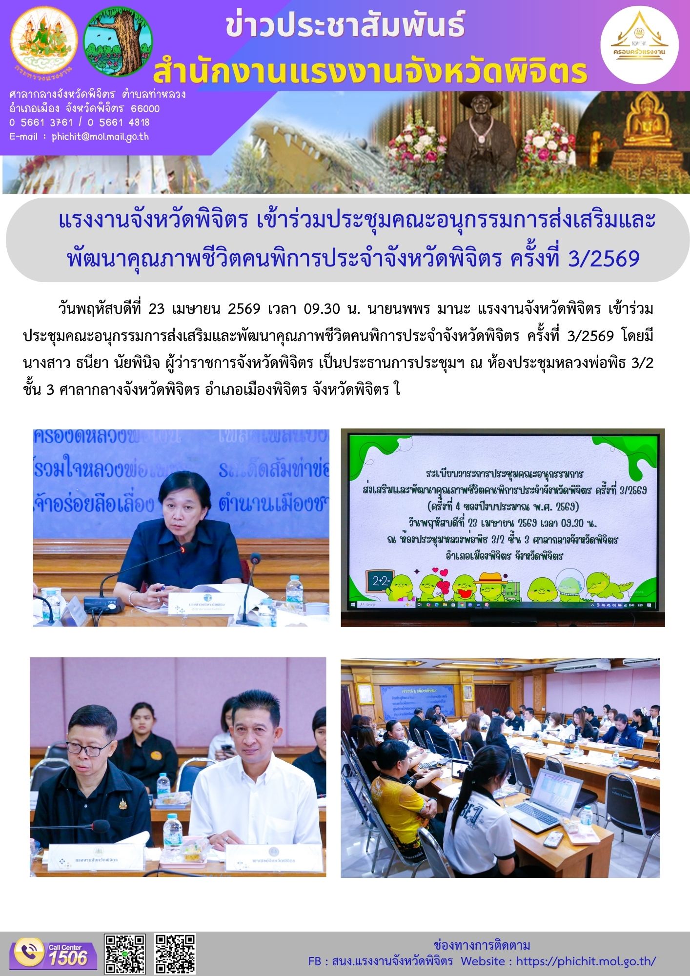 แรงงานจังหวัดพิจิตร เข้าร่วมประชุมคณะอนุกรรมการส่งเสริมและพัฒนาคุณภาพชีวิตคนพิการประจำจังหวัดพิจิตร ครั้งที่ 3/2569