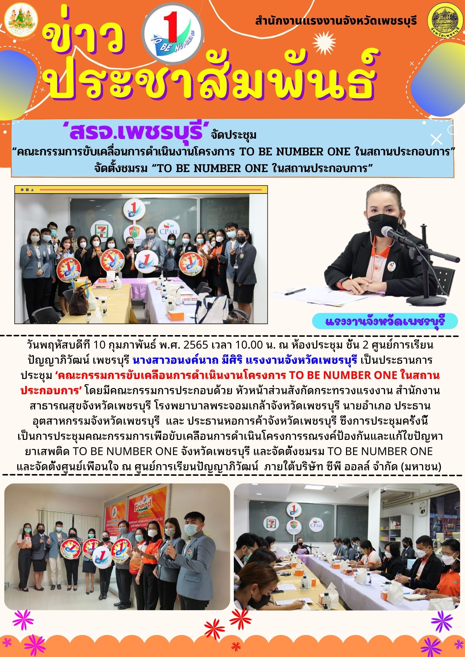 วันพฤหัสบดีที่ 10 กุมภาพันธ์ พ.ศ. 2565 เวลา 10.00 น. ณ ห้องประชุม ชั้น 2 ศูนย์การเรียนปัญญาภิวัฒน์ เพชรบุรี นางสาวอนงค์นาถ มีศิริ แรงงานจังหวัดเพชรบุรี เป็นประธานการประชุม ‘คณะกรรมการขับเคลื่อนการดำเนินงานโครงการ TO BE NUMBER ONE ในสถานประกอบการ’ โดยมีคณะกรรมการประกอบด้วย หัวหน้าส่วนสังกัดกระทรวงแรงงาน สำนักงานสาธารณสุขจังหวัดเพชรบุรี โรงพยาบาลพระจอมเกล้าจังหวัดเพชรบุรี นายอำเภอ ประธานอุตสาหกรรมจังหวัดเพชรบุรี และ ประธานหอการค้าจังหวัดเพชรบุรี ซึ่งการประชุมครั้งนี้เป็นการประชุมคณะกรรมการเพื่อขับเคลื่อนการดำเนินโครงการรณรงค์ป้องกันและแก้ไขปัญหายาเสพติด TO BE NUMBER ONE จังหวัดเพชรบุรี และจัดตั้งชมรม TO BE NUMBER ONE และจัดตั้งศูนย์เพื่อนใจ ณ ศูนย์การเรียนปัญญาภิวัฒน์ ภายใต้บริษัท ซีพี ออลล์ จำกัด (มหาชน)