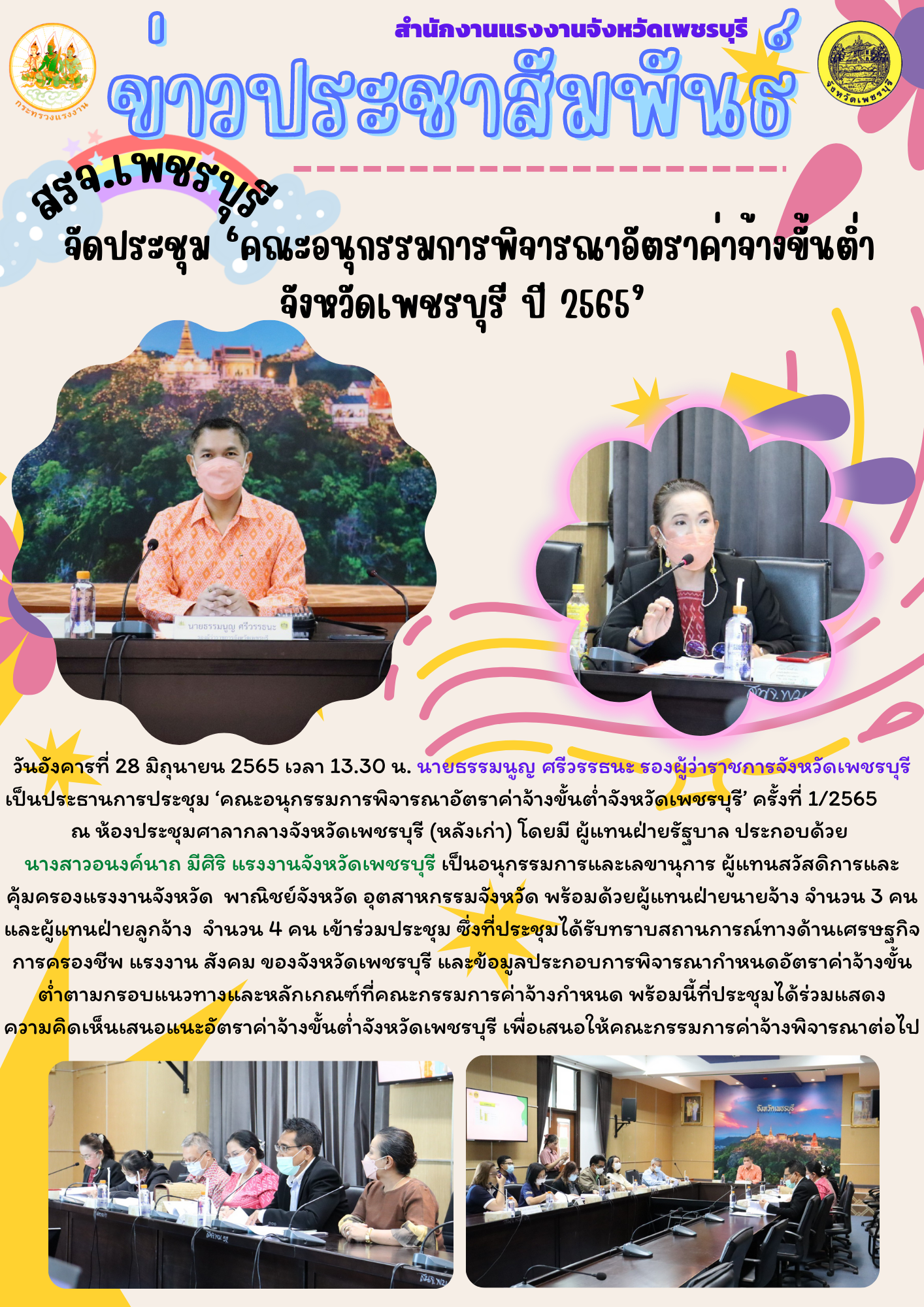 วันอังคารที่ 28 มิถุนายน 2565 เวลา 13.30 น. นายธรรมนูญ ศรีวรรธนะ รองผู้ว่าราชการจังหวัดเพชรบุรี เป็นประธานการประชุม ‘คณะอนุกรรมการพิจารณาอัตราค่าจ้างขั้นต่ำจังหวัดเพชรบุรี’ ครั้งที่ 1/2565 ณ ห้องประชุมศาลากลางจังหวัดเพชรบุรี (หลังเก่า) โดยมี ผู้แทนฝ่ายรัฐบาล ประกอบด้วย นางสาวอนงค์นาถ มีศิริ แรงงานจังหวัดเพชรบุรี เป็นอนุกรรมการและเลขานุการ ผู้แทนสวัสดิการและคุ้มครองแรงงานจังหวัด พาณิชย์จังหวัด อุตสาหกรรมจังหวัด พร้อมด้วยผู้แทนฝ่ายนายจ้าง จำนวน 3 คน และผู้แทนฝ่ายลูกจ้าง จำนวน 4 คน เข้าร่วมประชุม ซึ่งที่ประชุมได้รับทราบสถานการณ์ทางด้านเศรษฐกิจ การครองชีพ แรงงาน สังคม ของจังหวัดเพชรบุรี และข้อมูลประกอบการพิจารณากำหนดอัตราค่าจ้างขั้นต่ำตามกรอบแนวทางและหลักเกณฑ์ที่คณะกรรมการค่าจ้างกำหนด พร้อมนี้ที่ประชุมได้ร่วมแสดงความคิดเห็นเสนอแนะอัตราค่าจ้างขั้นต่ำจังหวัดเพชรบุรี เพื่อเสนอให้คณะกรรมการค่าจ้างพิจารณาต่อไป
