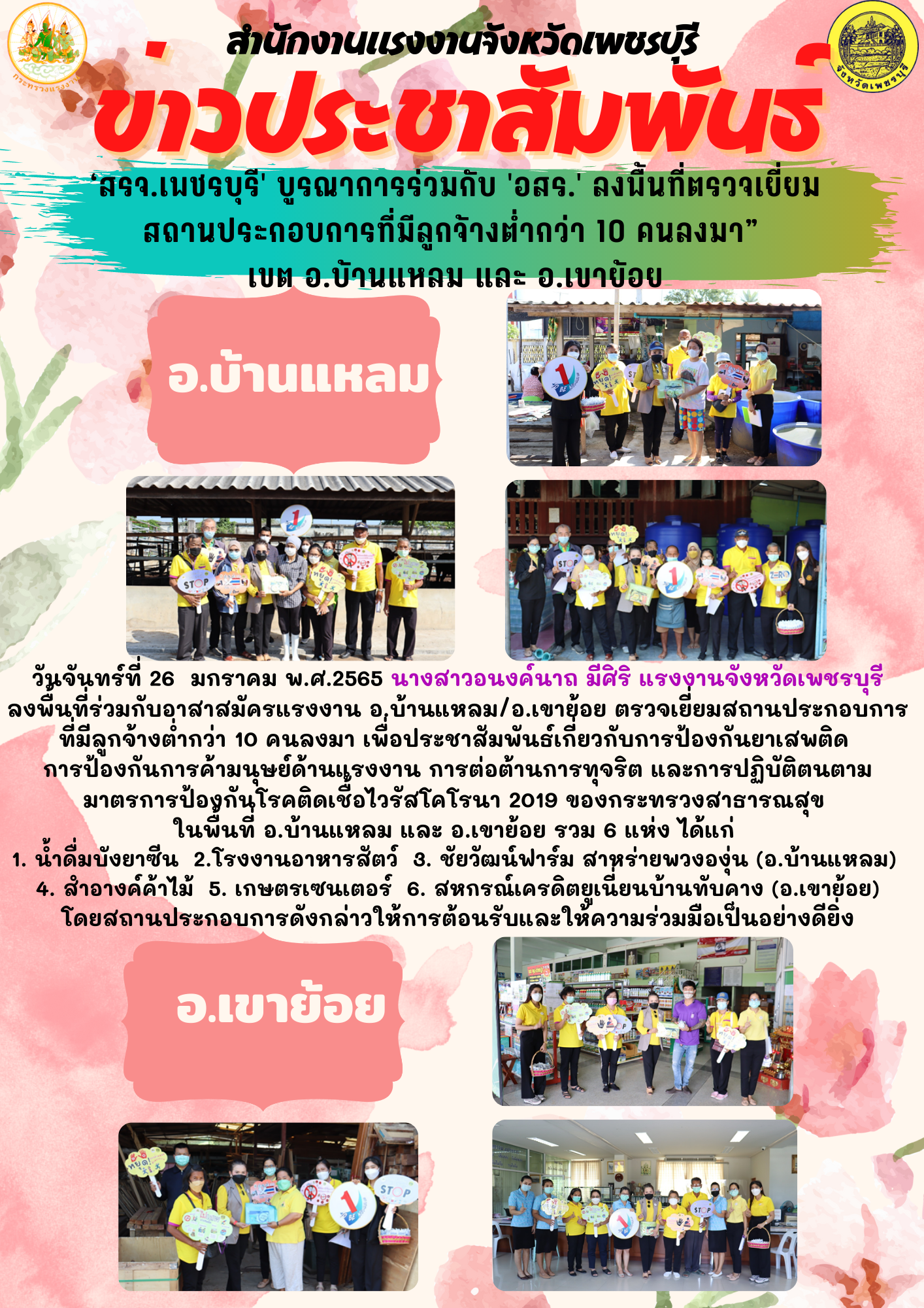 วันจันทร์ที่ 26 มกราคม พ.ศ.2565 นางสาวอนงค์นาถ มีศิริ แรงงานจังหวัดเพชรบุรี ลงพื้นที่ร่วมกับอาสาสมัครแรงงาน อ.บ้านแหลม/อ.เขาย้อย ตรวจเยี่ยมสถานประกอบการที่มีลูกจ้างต่ำกว่า 10 คนลงมา เพื่อประชาสัมพันธ์เกี่ยวกับการป้องกันยาเสพติด การป้องกันการค้ามนุษย์ด้านแรงงาน การต่อต้านการทุจริต และการปฏิบัติตนตามมาตรการป้องกันโรคติดเชื้อไวรัสโคโรนา 2019 ของกระทรวงสาธารณสุข ในพื้นที่ อ.บ้านแหลม และ อ.เขาย้อย รวม 6 แห่ง ได้แก่ 1. น้ำดื่มบังยาซีน 2.โรงงานอาหารสัตว์ 3. ชัยวัฒน์ฟาร์ม สาหร่ายพวงองุ่น (อ.บ้านแหลม) 4. สำอางค้าไม้ 5. เกษตรเซนเตอร์ 6. สหกรณ์เครดิตยูเนี่ยนบ้านทับคาง (อ.เขาย้อย) โดยสถานประกอบการดังกล่าวให้การต้อนรับและให้ความร่วมมือเป็นอย่างดียิ่ง