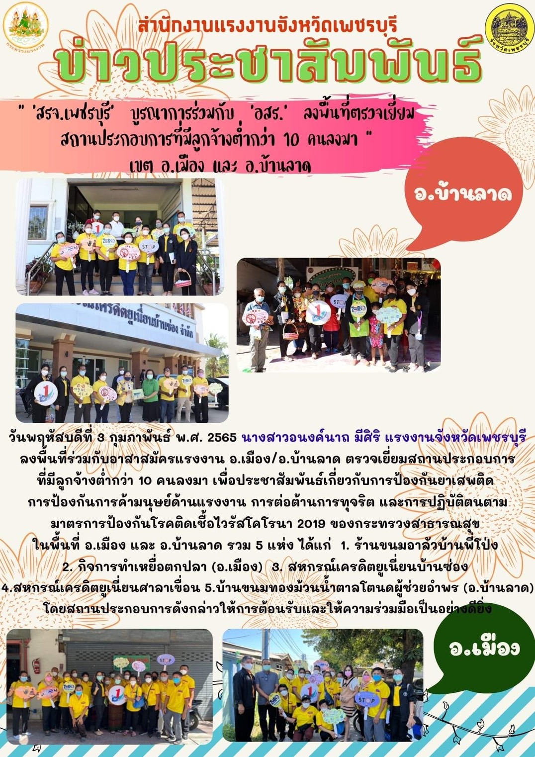 วันพฤหัสบดีที่ 3 กุมภาพันธ์ พ.ศ. 2565 นางสาวอนงค์นาถ มีศิริ แรงงานจังหวัดเพชรบุรี ลงพื้นที่ร่วมกับอาสาสมัครแรงงาน อ.เมือง/อ.บ้านลาด ตรวจเยี่ยมสถานประกอบการที่มีลูกจ้างต่ำกว่า 10 คนลงมา เพื่อประชาสัมพันธ์เกี่ยวกับการป้องกันยาเสพติด การป้องกันการค้ามนุษย์ด้านแรงงาน การต่อต้านการทุจริต และการปฏิบัติตนตามมาตรการป้องกันโรคติดเชื้อไวรัสโคโรนา 2019 ของกระทรวงสาธารณสุข ในพื้นที่ อ.เมือง และ อ.บ้านลาด รวม 5 แห่ง ได้แก่ 1. ร้านขนมอาลัวบ้านพี่โป่ง 2. กิจการทำเหยื่อตกปลา (อ.เมือง) 3. สหกรณ์เครดิตยูเนี่ยนบ้านซ่อง จำกัด 4.สหกรณ์เครดิตยูเนี่ยนศาลาเขื่อน 5. บ้านขนมทองม้วนน้ำตาลโตนดผู้ช่วยอำพร (อ.บ้านลาด) โดยสถานประกอบการดังกล่าวให้การต้อนรับและให้ความร่วมมือเป็นอย่างดียิ่ง
