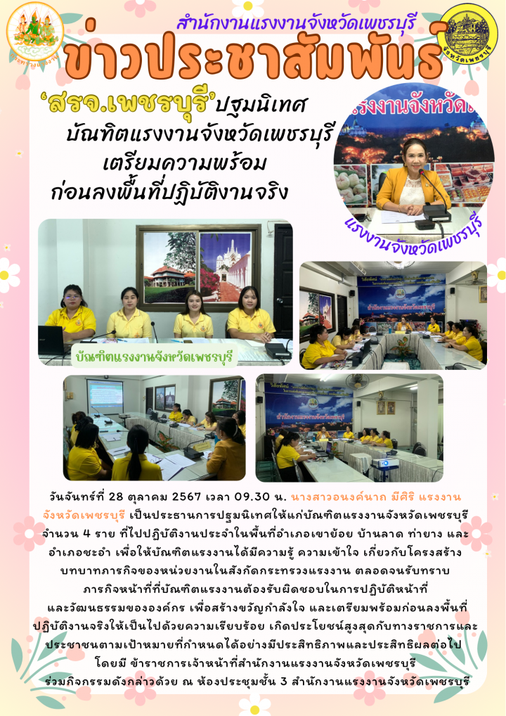 วันจันทร์ที่ 28 ตุลาคม 2567 เวลา 09.30 น. นางสาวอนงค์นาถ มีศิริ แรงงานจังหวัดเพชรบุรี เป็นประธานการปฐมนิเทศให้แก่บัณฑิตแรงงานจังหวัดเพชรบุรี จำนวน 4 ราย ที่ไปปฏิบัติงานประจำในพื้นที่อำเภอเขาย้อย บ้านลาด ท่ายาง และอำเภอชะอำ เพื่อให้บัณฑิตแรงงานได้มีความรู้ ความเข้าใจ เกี่ยวกับโครงสร้าง บทบาทภารกิจของหน่วยงานในสังกัดกระทรวงแรงงานตลอดจนรับทราบ ภารกิจหน้าที่ที่บัณฑิตแรงงานต้องรับผิดชอบในการปฏิบัติหน้าที่ และวัฒนธรรมขององค์กร เพื่อสร้างขวัญกำลังใจ และเตรียมพร้อมก่อนลงพื้นที่ปฏิบัติงานจริงให้เป็นไปด้วยความเรียบร้อย เกิดประโยชน์สูงสุดกับทางราชการและประชาชนตามเป้าหมายที่กำหนดได้อย่างมีประสิทธิภาพและประสิทธิผลต่อไป โดยมี ข้าราชการเจ้าหน้าที่สำนักงานแรงงานจังหวัดเพชรบุรี ร่วมกิจกรรมดังกล่าวด้วย ณ ห้องประชุม ชั้น 3 สำนักงานแรงงานจังหวัดเพชรบุรี