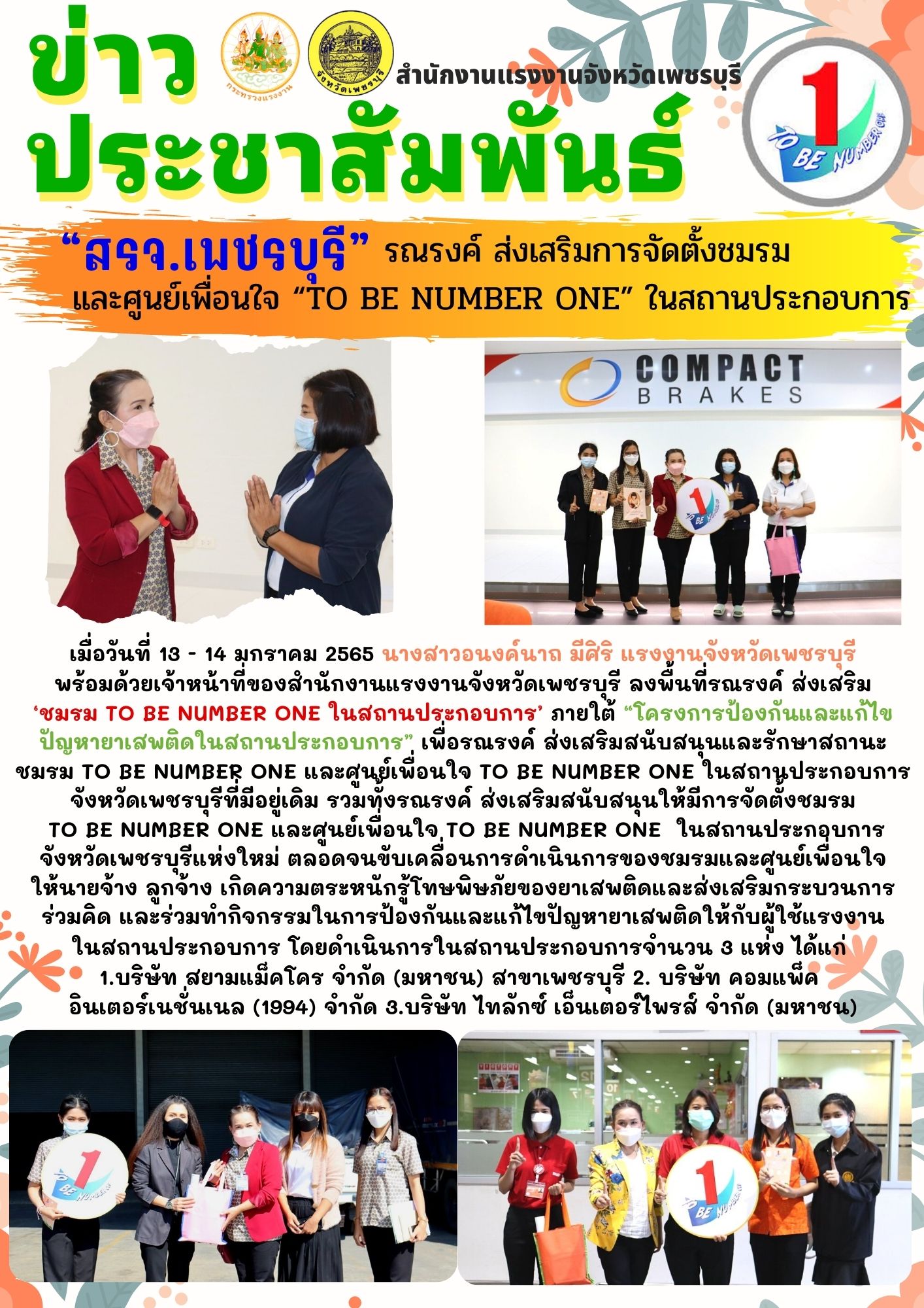 เมื่อวันที่ 13 – 14 มกราคม 2565 นางสาวอนงค์นาถ มีศิริ แรงงานจังหวัดอุตรดิตถ์ พร้อมด้วยเจ้าหน้าที่ของสำนักงานแรงงานจังหวัดเพชรบุรีลงพื้นที่รณรงค์ ส่งเสริม ‘ชมรม TO BE NUMBER ONE ในสถานประกอบการ’ ภายใต้ “โครงการป้องกันและแก้ไขปัญหายาเสพติดในสถานประกอบการ” เพื่อรณรงค์ส่งเสริมสนับสนุนและรักษาสถานะชมรม TO BE NUMBER ONE และศูนย์เพื่อนใจ TO BE NUMBER ONE ในสถานประกอบการจังหวัดเพชรบุรีที่มีอยู่เดิม รวมทั้งรณรงค์ ส่งเสริมสนับสนุนให้มีการจัดตั้งชมรม TO BE NUMBER ONE และศูนย์เพื่อนใจ TO BE NUMBER ONE ในสถานประกอบการจังหวัดเพชรบุรีแห่งใหม่ ตลอดจนขับเคลื่อนการดำเนินการของชมรมและศูนย์เพื่อนใจให้นายจ้าง ลูกจ้าง เกิดความตระหนักรู้โทษพิษภัยของยาเสพติดและส่งเสริมกระบวนการร่วมคิด และร่วมทำกิจกรรมในการป้องกันและแก้ไขปัญหายาเสพติดให้กับผู้ใช้แรงงานในสถานประกอบการ โดยดำเนินการในสถานประกอบการจำนวน 3 แห่ง ได้แก่ 1.บริษัท สมามแม็คโคร จำกัด (มหาชน) สาขาเพชรบุรี 2. บริษัท คอมแพ็ค อินเตอร์เนชั่นเนล (1994) จำกัด 3.บริษัท ไทลักซ์ เอ็นเตอร์ไพรส์ จำกัด (มหาชน)