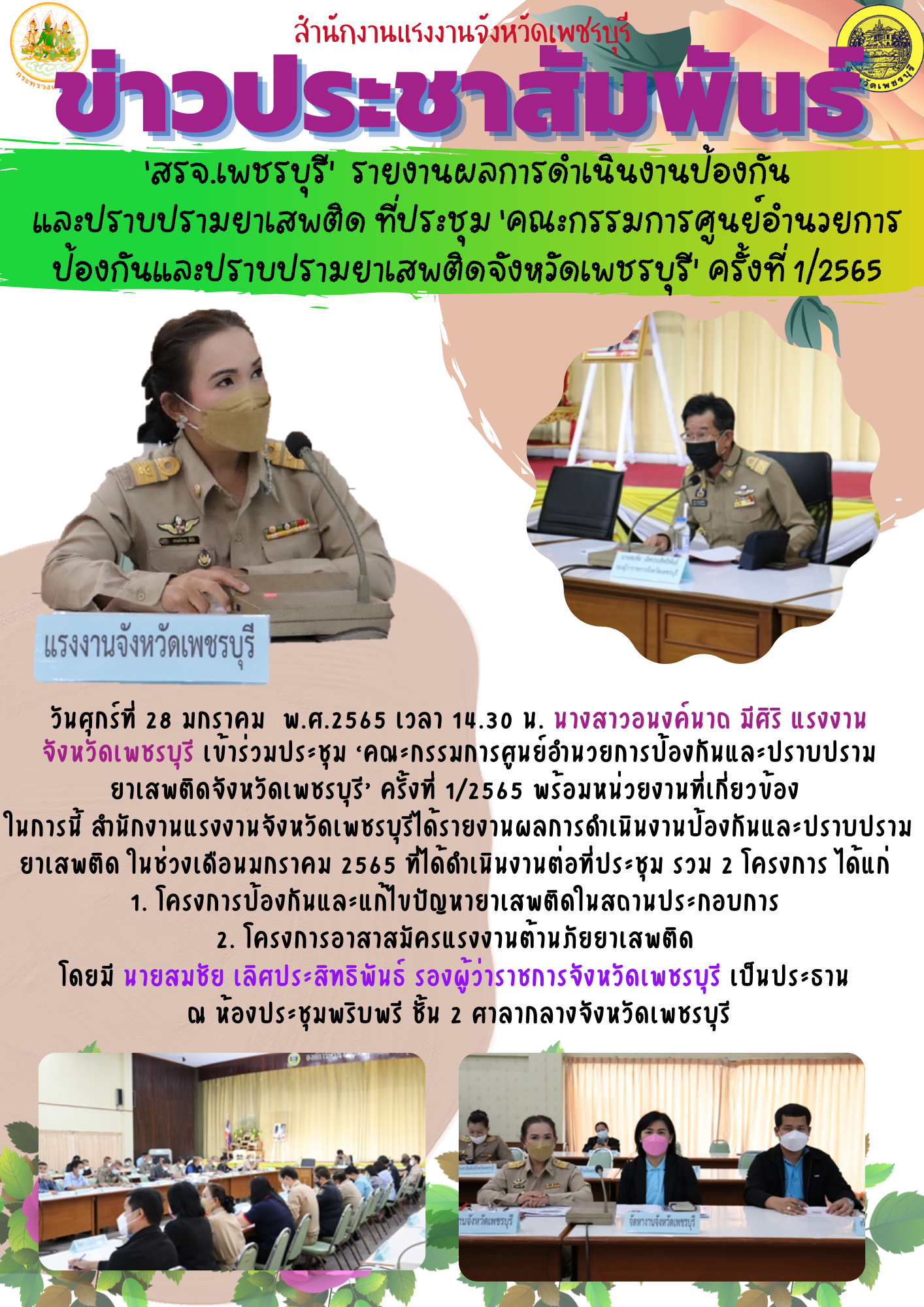 วันศุกร์ที่ 28 มกราคม พ.ศ.2565 เวลา 14.30 น. นางสาวอนงค์นาถ มีศิริ แรงงานจังหวัดเพชรบุรี เข้าร่วมประชุม ‘คณะกรรมการศูนย์อำนวยการป้องกันและปราบปรามยาเสพติดจังหวัดเพชรบุรี’ ครั้งที่1/2565 พร้อมหน่วยงานที่เกี่ยวข้อง ในการนี้ สำนักงานแรงงานจังหวัดเพชรบุรีได้รายงานผลการดำเนินงานป้องกันและปราบปรามยาเสพติด ในช่วงเดือนมกราคม 2565 ที่ได้ดำเนินงานต่อที่ประชุม รวม 2 โครงการ ได้แก่ 1. โครงการป้องกันและแก้ไขปัญหายาเสพติดในสถานประกอบการ 2. โครงการอาสาสมัครแรงงานต้านภัย ยาเสพติด โดยมี นายสมชัย เลิศประสิทธิพันธ์ รองผู้ว่าราชการจังหวัดเพชรบุรี เป็นประธาน ณ ห้องประชุมพริบพรี ชั้น 2 ศาลากลางจังหวัดเพชรบุรี