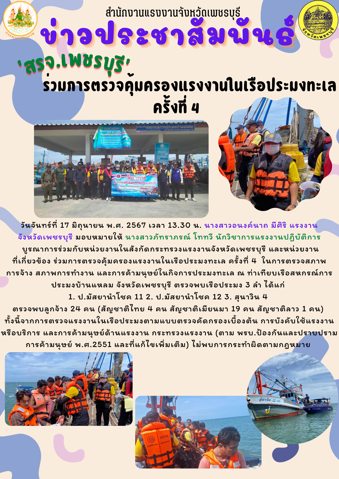 วันจันทร์ที่ 17 มิถุนายน พ.ศ. 2567 เวลา 13.30 น. นางสาวอนงค์นาถ มีศิริ แรงงานจังหวัดเพชรบุรี มอบหมายให้ นางสาวภัทราภรณ์ โททวี นักวิชาการแรงงานปฏิบัติการ บูรณาการร่วมกับหน่วยงานในสังกัดกระทรวงแรงงานจังหวัดเพชรบุรี และหน่วยงานที่เกี่ยวข้อง ร่วมการตรวจคุ้มครองแรงงานในเรือประมงทะเล ครั้งที่ 4 ในการตรวจสภาพการจ้าง สภาพการทำงาน และการค้ามนุษย์ในกิจการประมงทะเล ณ ท่าเทียบเรือสหกรณ์การประมงบ้านแหลม จังหวัดเพชรบุรี ตรวจพบเรือประมง 3 ลำ ได้แก่