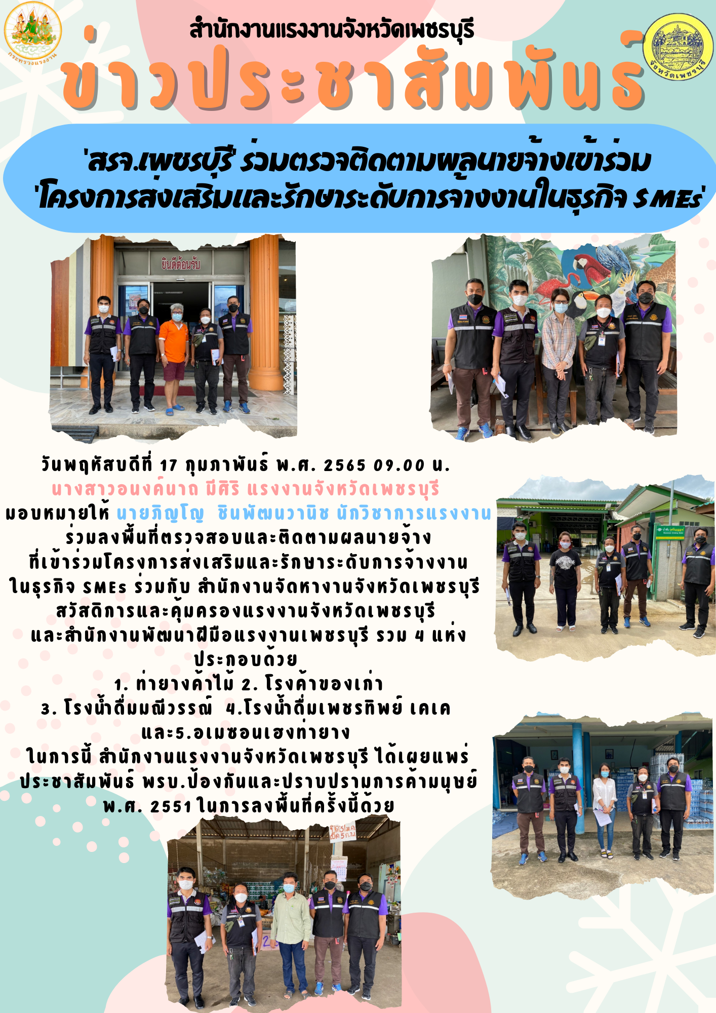 วันพฤหัสบดีที่ 17 กุมภาพันธ์ พ.ศ. 2565 09.00 น. นางสาวอนงค์นาถ มีศิริ แรงงานจังหวัดเพชรบุรี มอบหมายให้ นายภิญโญ ชินพัฒนวานิช นักวิชาการแรงงาน ร่วมลงพื้นที่ตรวจสอบและติดตามผลนายจ้าง ที่เข้าร่วมโครงการส่งเสริมและรักษาระดับการจ้างงาน ในธุรกิจ SMEs ร่วมกับ สำนักงานจัดหางานจังหวัดเพชรบุรี สวัสดิการและคุ้มครองแรงงานจังหวัดเพชรบุรี และสำนักงานพัฒนาฝีมือแรงงานเพชรบุรี รวม 4 แห่ง ประกอบด้วย 1. ท่ายางค้าไม้ 2. โรงค้าของเก่า 3. โรงน้ำดื่มมณีวรรณ์ 4. โรงน้ำดื่มเพชรทิพย์ เคเค และ 5.อเมซอนเฮงท่ายาง ในการนี้ สำนักงานแรงงานจังหวัดเพชรบุรี ได้เผยแพร่ประชาสัมพันธ์ พรบ.ป้องกันและปราบปรามการค้ามนุษย์ พ.ศ. 2551 ในการลงพื้นที่ครั้งนี้ด้วย