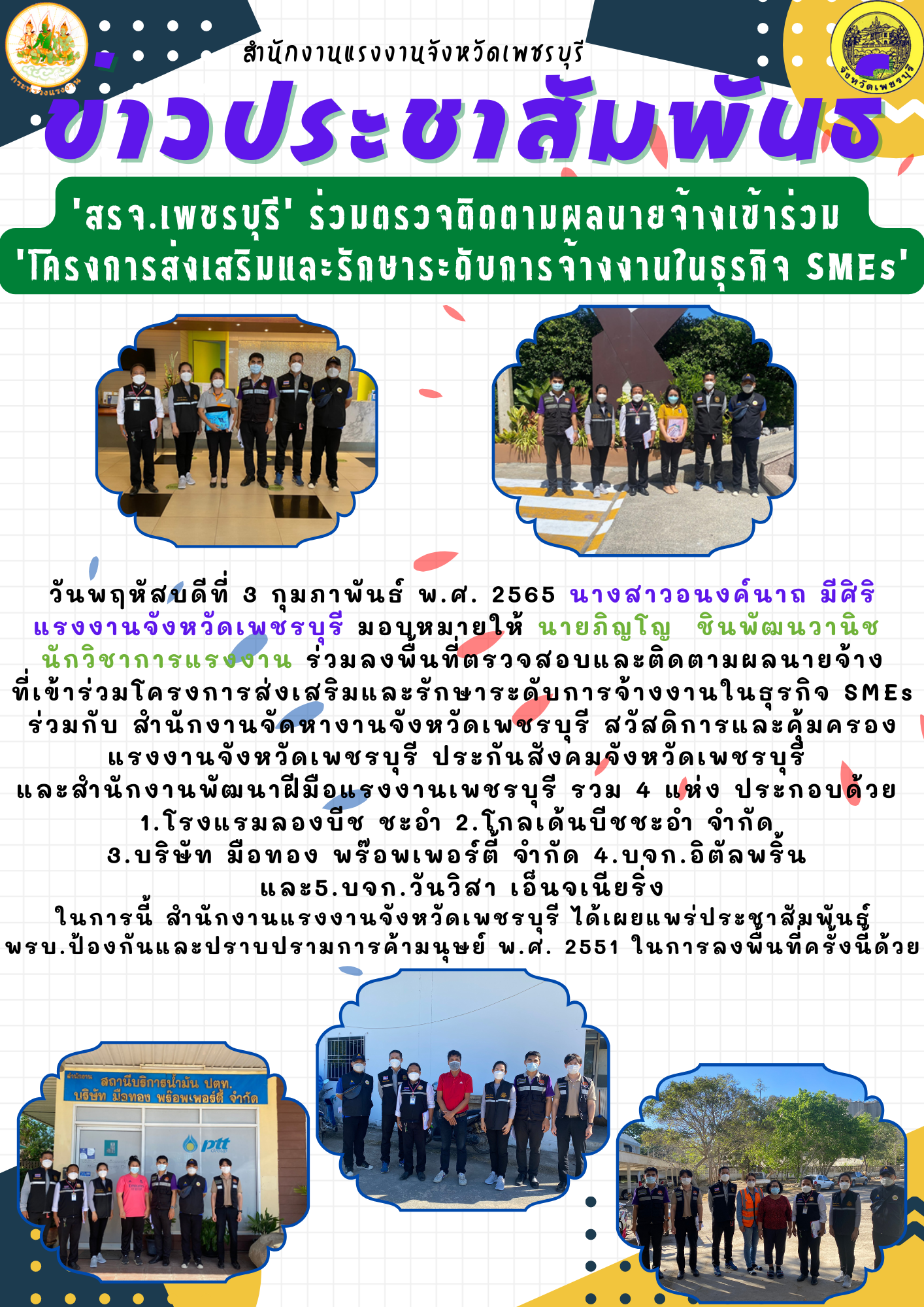 วันพฤหัสบดีที่ 3 กุมภาพันธ์ พ.ศ. 2565 เวลา 09.00 น. นางสาวอนงค์นาถ มีศิริ แรงงานจังหวัดเพชรบุรี มอบหมายให้ นายภิญโญ ชินพัฒนวานิช นักวิชาการแรงงาน ร่วมลงพื้นที่ตรวจสอบและติดตามผลนายจ้างที่เข้าร่วมโครงการส่งเสริมและรักษาระดับการจ้างงานในธุรกิจ SMEs ร่วมกับ สำนักงานจัดหางานจังหวัดเพชรบุรี สวัสดิการและคุ้มครองแรงงานเพชรบุรี ประกันสังคมจังหวัดเพชรบุรี และสำนักงานพัฒนาฝีมือแรงงานเพชรบุรี รวม 4 แห่ง ประกอบด้วย 1. โรงแรมลองบีช ชะอำ 2. โกลเด้นบีชชะอำ จำกัด 3.บริษัท มือทอง พร๊อพเพอร์ตี้ จำกัด 4.บจก.อิตัลพริ้น และ5.บจก.วันวิสา เอ็นจเนียริ่ง ในการนี้ สำนักงานแรงงานจังหวัดเพชรบุรี ได้เผยแพร่ประชาสัมพันธ์ พรบ.ป้องกันและปราบปรามการค้ามนุษย์ พ.ศ. 2551 ในการลงพื้นที่ครั้งนี้ด้วย