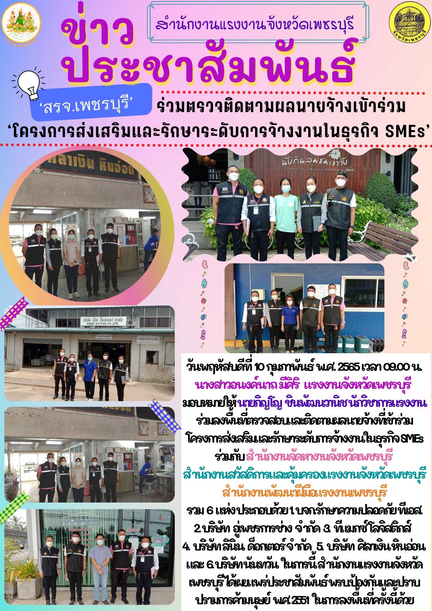 วันพฤหัสบดีที่ 10 กุมภาพันธ์ พ.ศ. 2565 เวลา 09.00 น. นางสาวอนงค์นาถ มีศิริ แรงงานจังหวัดเพชรบุรี มอบหมายให้ นายภิญโญ ชินพัฒนวานิช นักวิชาการแรงงาน ร่วมลงพื้นที่ตรวจสอบและติดตามผลนายจ้างที่เข้าร่วมโครงการส่งเสริมและรักษาระดับการจ้างงานในธุรกิจ SMEs ร่วมกับ สำนักงานจัดหางานจังหวัดเพชรบุรี สำนักงานสวัสดิการและคุ้มครองแรงงานจังหวัดเพชรบุรี สำนักงานพัฒนาฝีมือแรงงานเพชรบุรี รวม 6 แห่ง ประกอบด้วย 1. บจก.รักษาความปลอดภัย ที.เอส. 2. บริษัท อู่เพชรการช่าง จำกัด 3. ทีแมกซ์ โลจิสติกส์ 4. บริษัท ลินิน ด็อกเตอร์ จำกัด 5. บริษัท ศิลาเงิน หินอ่อน และ 6. บริษัท นันทวัน ในการนี้ สำนักงานแรงงานจังหวัดเพชรบุรี ได้เผยแพร่ประชาสัมพันธ์ พรบ.ป้องกันและปราบปรามการค้ามนุษย์ พ.ศ. 2551 ในการลงพื้นที่ครั้งนี้ด้วย