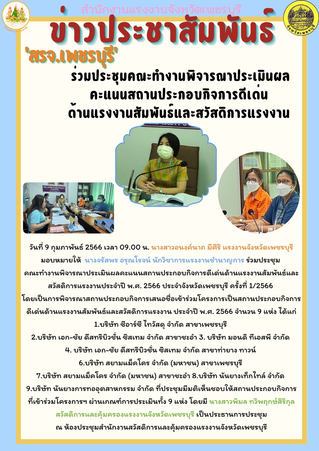 วันที่ 9 กุมภาพันธ์ 2566 เวลา 09.00 น. นางสาวอนงค์นาถ มีศิริ แรงงานจังหวัดเพชรบุรี มอบหมายให้ นางจรัสพร อรุณโรจน์ นักวิชาการแรงงานชำนาญการ ร่วมประชุมคณะทำงานพิจารณาประเมินผลคะแนนสถานประกอบกิจการดีเด่นด้านแรงงานสัมพันธ์และสวัสดิการแรงงาน ประจำปี พ.ศ. 2566 ประจำจังหวัดเพชรบุรี ครั้งที่ 1/2566 โดยเป็นการพิจารณาสถานประกอบกิจการเสนอชื่อเข้าร่วมโครงการเป็นสถานประกอบกิจการดีเด่นด้านแรงงานสัมพันธ์และสวัสดิการแรงงาน ประจำปี พ.ศ. 2566 จำนวน 9 แห่ง ได้แก่ 1.บริษัท ซีอาร์ซี ไทวัสดุ จำกัด สาขาเพชรบุรี 2.บริษัท เอก-ชัย ดีสทริบิวชั่น ซิสเทม จำกัด สาขาชะอำ 3. บริษัท มอนดิ ทีเอสพี จำกัด 4. บริษัท เอก-ชัย ดีสทริบิวชั่น ซิสเทม จำกัด สาขาท่ายาง ทาวน์ 6.บริษัท สยามแม็คโคร จำกัด (มหาชน) สาขาเพชรบุรี 7.บริษัท สยามแม็คโคร จำกัด (มหาชน) สาขาชะอำ 8.บริษัท นันยางเท็กไทล์ จำกัด 9.บริษัท นันยางการทออุตสาหกรรม จำกัด ที่ประชุมมีมติเห็นชอบให้สถานประกอบกิจการที่เข้าร่วมโครงการฯ ผ่านเกณฑ์การประเมินทั้ง 9 แห่ง โดยมี นางสาวทวิพฤกษ์สิริกุล สวัสดิการและคุ้มครองแรงงานจังหวัดเพชรบุรี เป็นประธาน ณ ห้องประชุมสำนักงานสวัสดิการและคุ้มครองแรงงานจังหวัดเพชรบุรี อ.เมืองเพชรบุรี จ.เพชรบุรี
