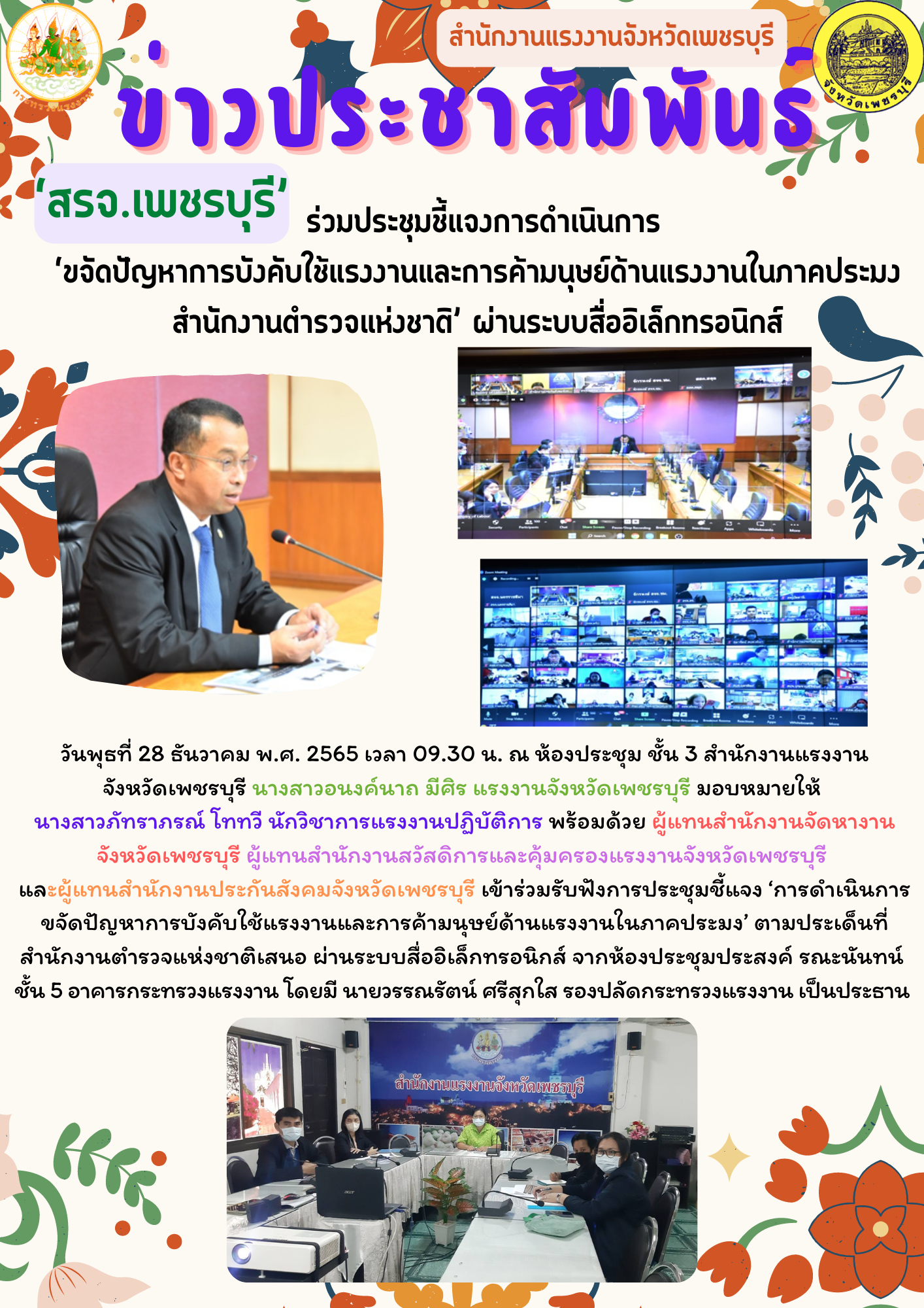 วันพุธที่ 28 ธันวาคม พ.ศ. 2565 เวลา 09.30 น. ณ ห้องประชุม ชั้น 3 สำนักงานแรงงานจังหวัดเพชรบุรี นางสาวอนงค์นาถ มีศิร แรงงานจังหวัดเพชรบุรี มอบหมายให้ นางสาวภัทราภรณ์ โททวี นักวิชาการแรงงานปฏิบัติการ พร้อมด้วย ผู้แทนสำนักงานจัดหางานจังหวัดเพชรบุรี ผู้แทนสำนักงานสวัสดิการและคุ้มครองแรงงานจังหวัดเพชรบุรี และผู้แทนสำนักงานประกันสังคมจังหวัดเพชรบุรี เข้าร่วมรับฟังการประชุมชี้แจง ‘การดำเนินการขจัดปัญหาการบังคับใช้แรงงานและการค้ามนุษย์ด้านแรงงานในภาคประมง’ ตามประเด็นที่สำนักงานตำรวจแห่งชาติเสนอ ผ่านระบบสื่ออิเล็กทรอนิกส์ จากห้องประชุมประสงค์ รณะนันทน์ ชั้น 5 อาคารกระทรวงแรงงาน โดยมี นายวรรณรัตน์ ศรีสุกใส รองปลัดกระทรวงแรงงาน เป็นประธาน