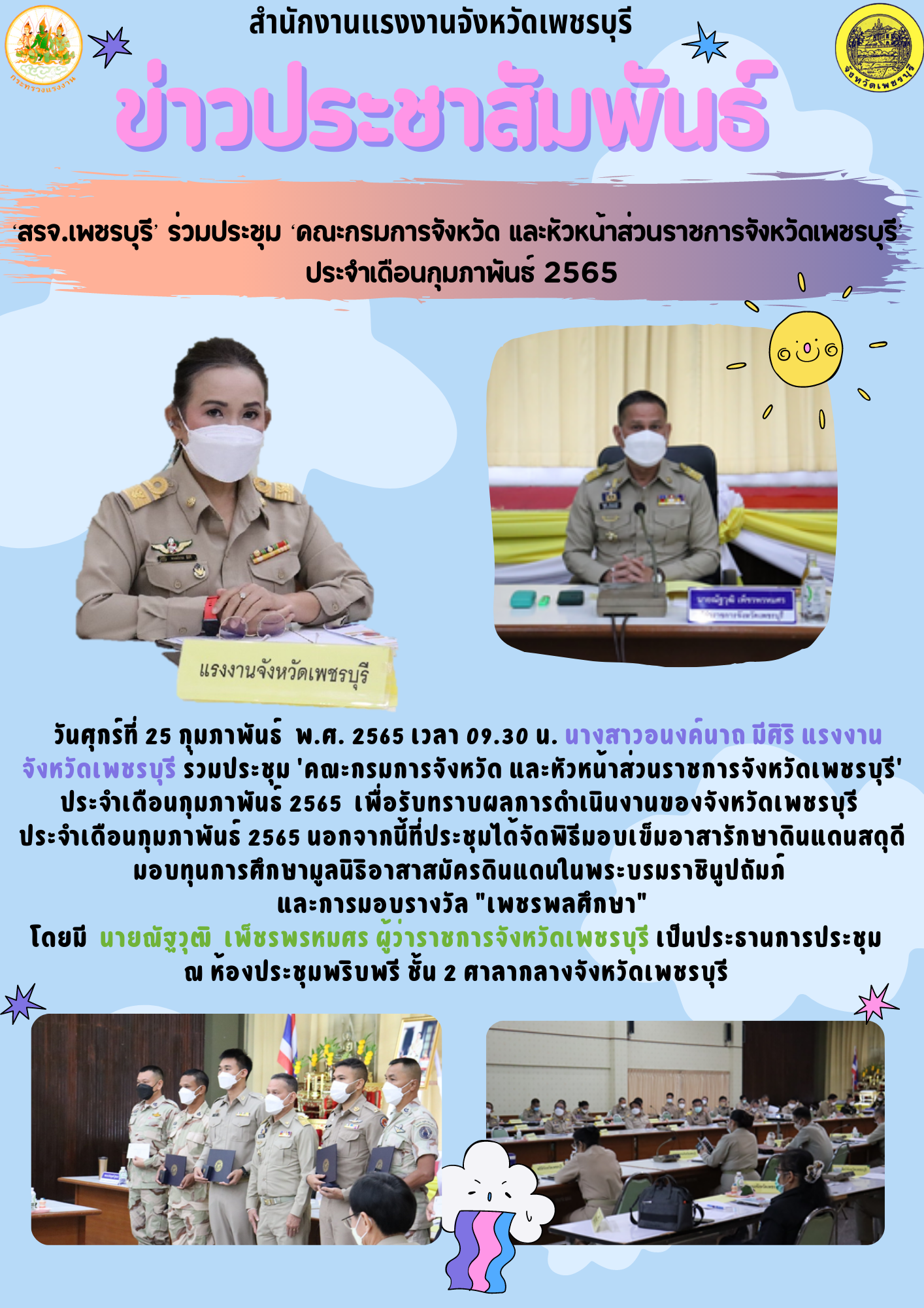 วันศุกร์ที่ 25 กุมภาพันธ์ พ.ศ. 2565 เวลา 09.30 น. นางสาวอนงค์นาถ มีศิริ แรงงานจังหวัดเพชรบุรี ร่วมประชุม ‘คณะกรมการจังหวัด และหัวหน้าส่วนราชการจังหวัดเพชรบุรี’ ประจำเดือนกุมภาพันธ์ 2565 เพื่อรับทราบผลการดำเนินงานของจังหวัดเพชรบุรี ประจำเดือนกุมภาพันธ์ 2565 นอกจากนี้ที่ประชุมได้จัดพิธีมอบเข็มอาสารักษาดินแดนสดุดี มอบทุนการศึกษามูลนิธิอาสาสมัครดินแดนในพระบรมราชินูปถัมภ์ และการมอบรางวัล “เพชรพลศึกษา” โดยมี นายณัฐวุฒิ เพ็ชรพรหมศร ผู้ว่าราชการจังหวัดเพชรบุรี เป็นประธานการประชุม ณ ห้องประชุมพริบพรี ชั้น 2 ศาลากลางจังหวัดเพชรบุรี