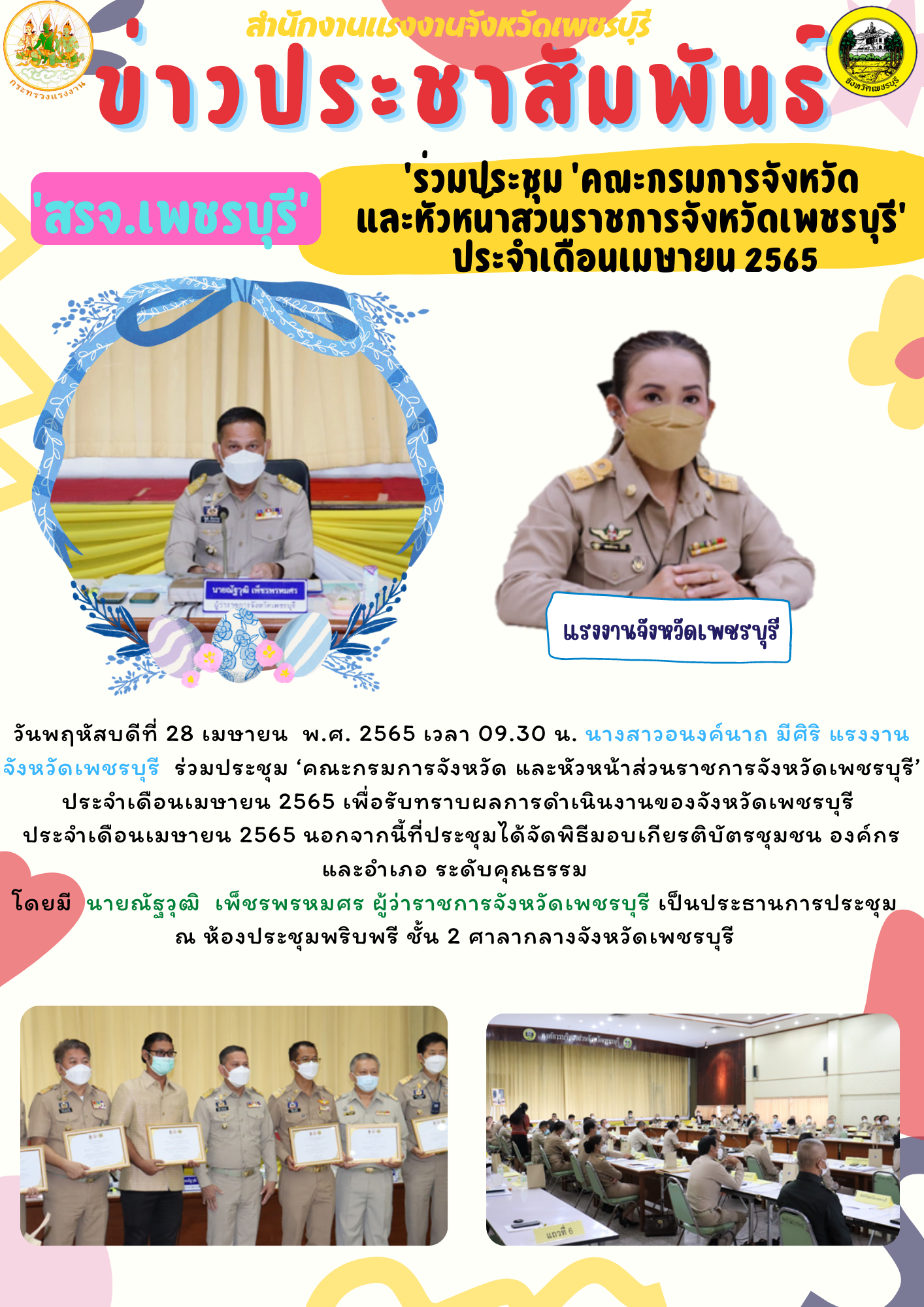 วันพฤหัสบดีที่ 28 เมษายน พ.ศ. 2565 เวลา 09.30 น. นางสาวอนงค์นาถ มีศิริ แรงงานจังหวัดเพชรบุรี ร่วมประชุม ‘คณะกรมการจังหวัด และหัวหน้าส่วนราชการจังหวัดเพชรบุรี’ ประจำเดือนเมษายน 2565 เพื่อรับทราบผลการดำเนินงานของจังหวัดเพชรบุรี ประจำเดือนเมษายน 2565 นอกจากนี้ที่ประชุมได้จัดพิธีมอบเกียรติบัตรชุมชน องค์กร และอำเภอ ระดับคุณธรรม และรายงานผลการดำเนินงานของจังหวัดเพชรบุรี ประจำเดือนเมษายน 2565 โดยมี นายณัฐวุฒิ เพ็ชรพรหมศร ผู้ว่าราชการจังหวัดเพชรบุรี เป็นประธานการประชุม ณ ห้องประชุมพริบพรี ชั้น 2 ศาลากลางจังหวัดเพชรบุรี